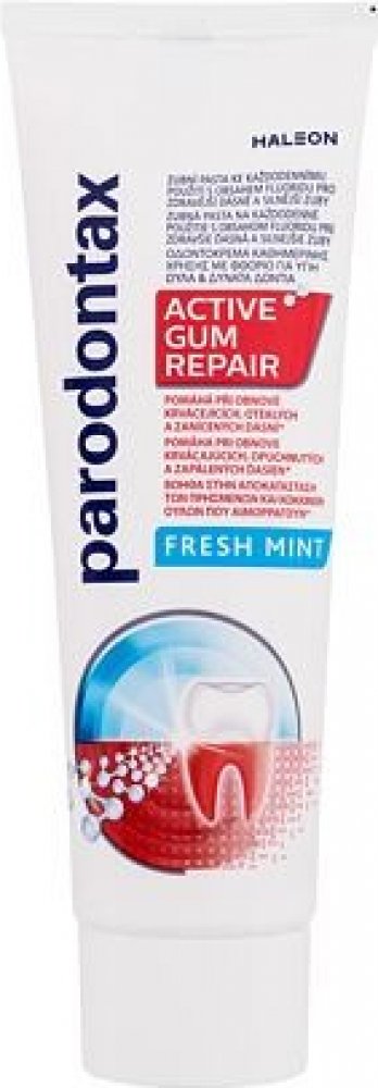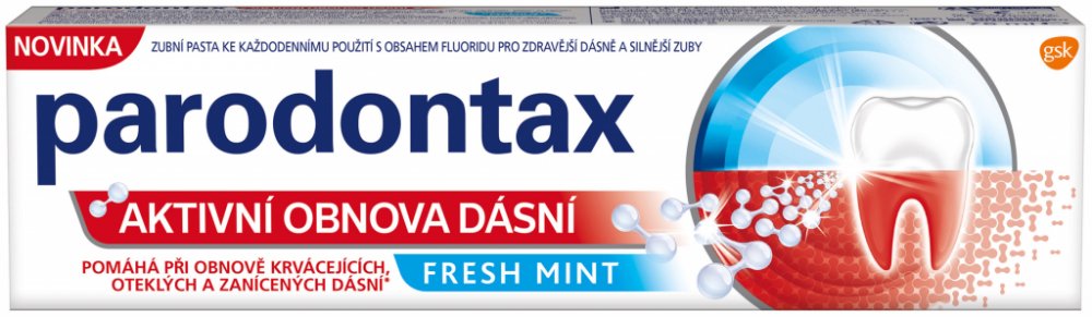 Zubní pasta parodontax Aktivní obnova dásní Fresh mint pomáhá při obnově krvácejících, oteklých a zanícených dásní*. Cílí na hlavní příčinu počátečních příznaků onemocnění dásní: zubní plak. Díky technologii ActivMin dochází k aktivnímu odstranění bakterií zubního plaku pro obnovu dásní*.