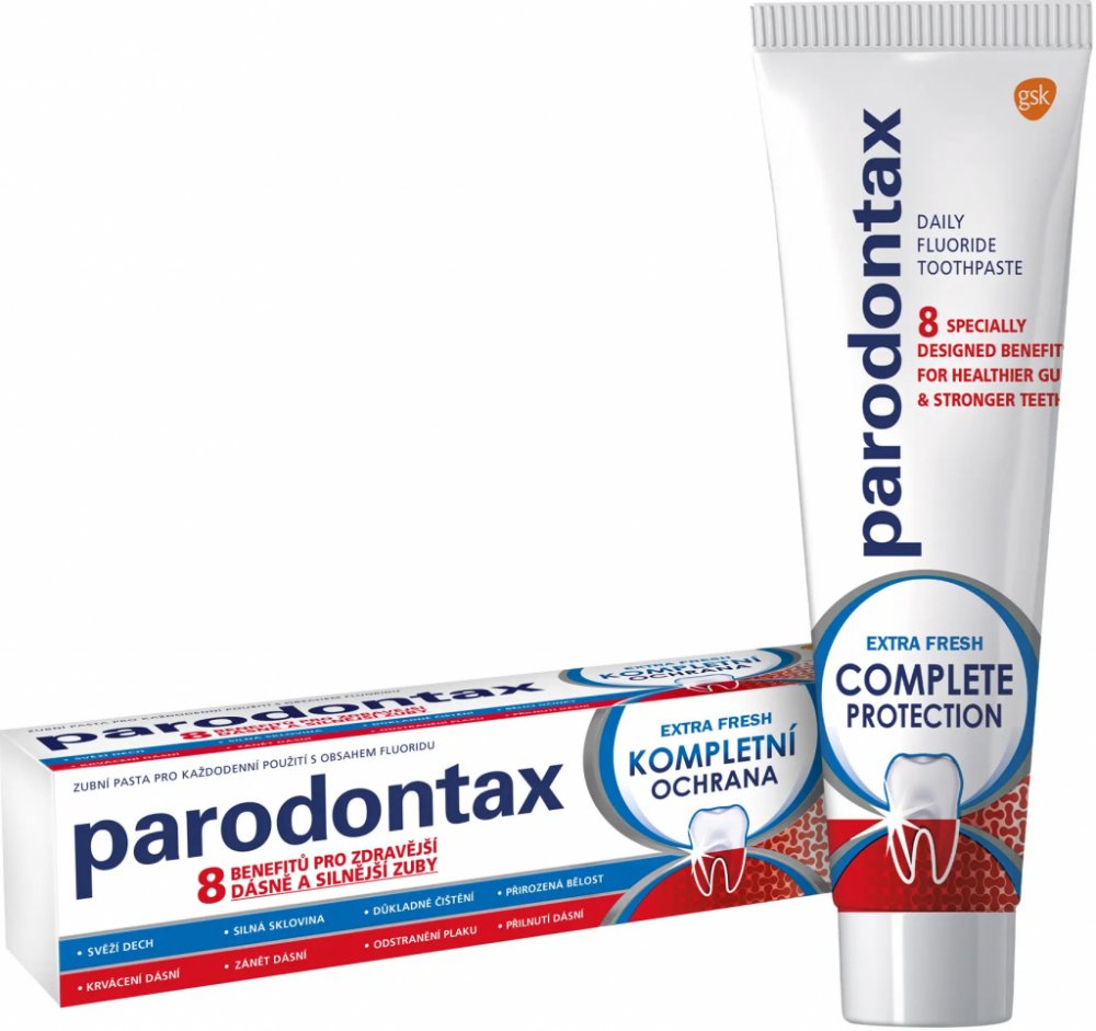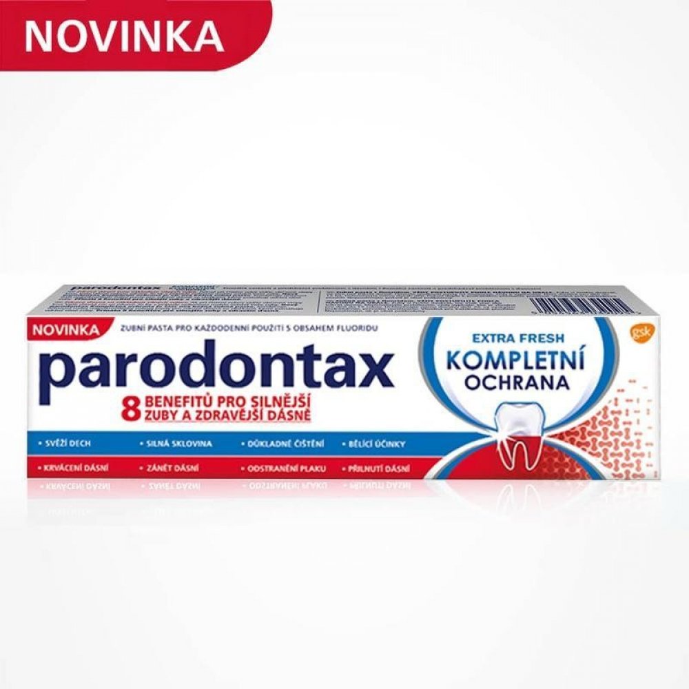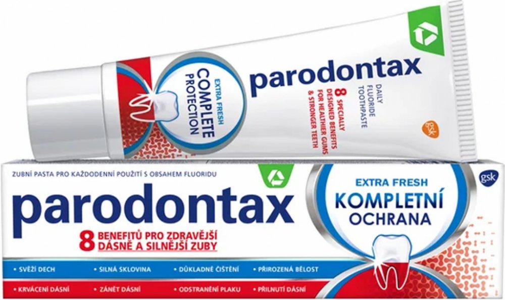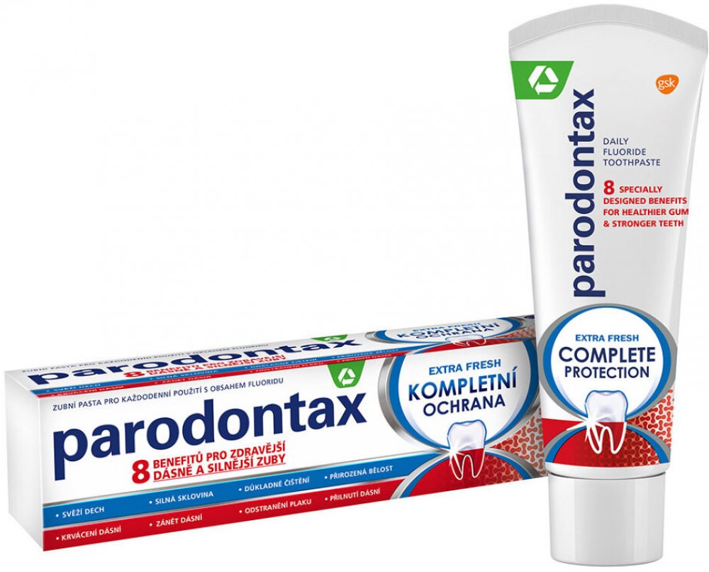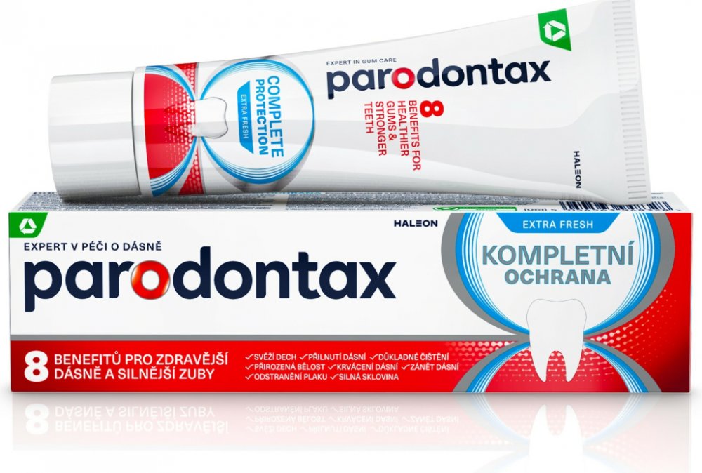 Zubní pasta Parodontax Kompletní ochrana Extra Fresh odstraňuje více zubního plaku než běžná zubní pasta a zanechává pocit čistých svěžích úst.