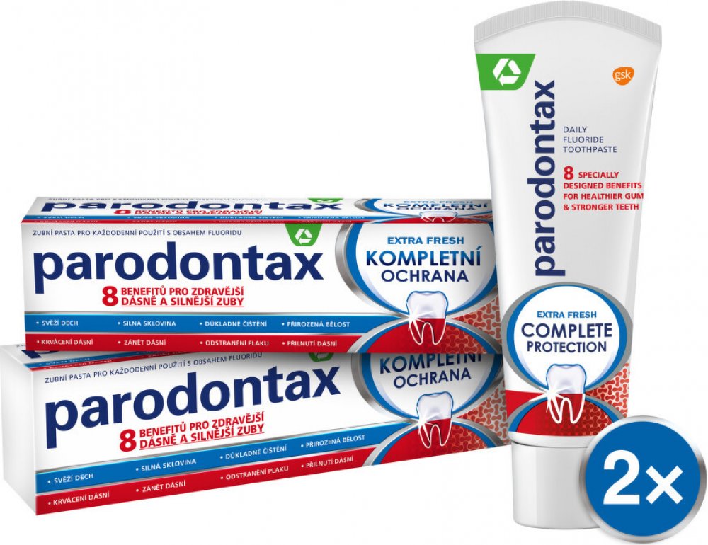 Paradontax Kompletní ochrana Extra fresh je zubní pasta ke každodennímu použití s obsahem fluoridu. Přináší mnoho benefitů pro zdravější dásně a silnější zuby.neobsahuje Sodium Lauryl Sulfatepro každodenní použitís obsahem fluoridusvěží příchuťpomáhá zastavit a předcházet krvácení dásní4x účinnější při odstraňování zubního plakuObsahuje 75 ml pasty.