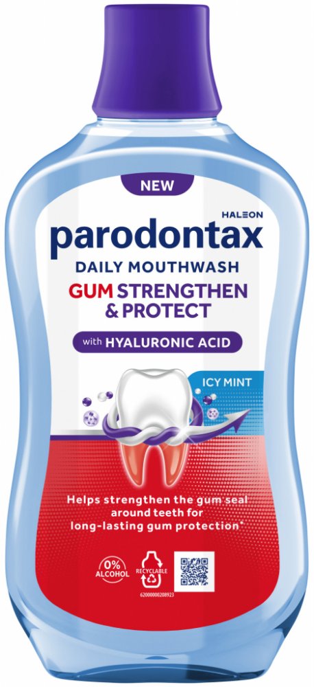 péče o zubní sklovinu posílení a ochrana dásní s kyselinou hyaluronovou a fluoridem bez alkoholu parodontax ústní voda Posílení a Ochrana dásní Icy Mint při pravidelném používání pomáhá posílit přilnutí dásní k zubům. Díky tomu pomáhá dlouhodobě chránit dásně. Ústní voda je s fluoridem, s kyselinou hyaluronovou a neobsahuje alkohol.