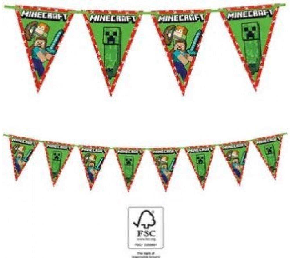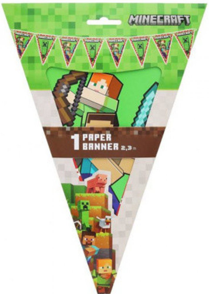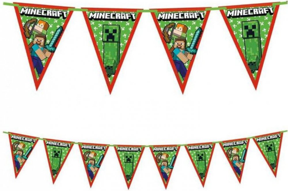 Na každé vlaječce je výrazně vytištěn nápis Minecraft, který celý motiv sjednocuje a umocňuje tématickou atmosféru. Girlanda je vyrobena z kvalitního papíru, snadno se zavěšuje a krásně vynikne jako ozdoba stěny, dveří nebo prostoru nad slavnostním stolem.