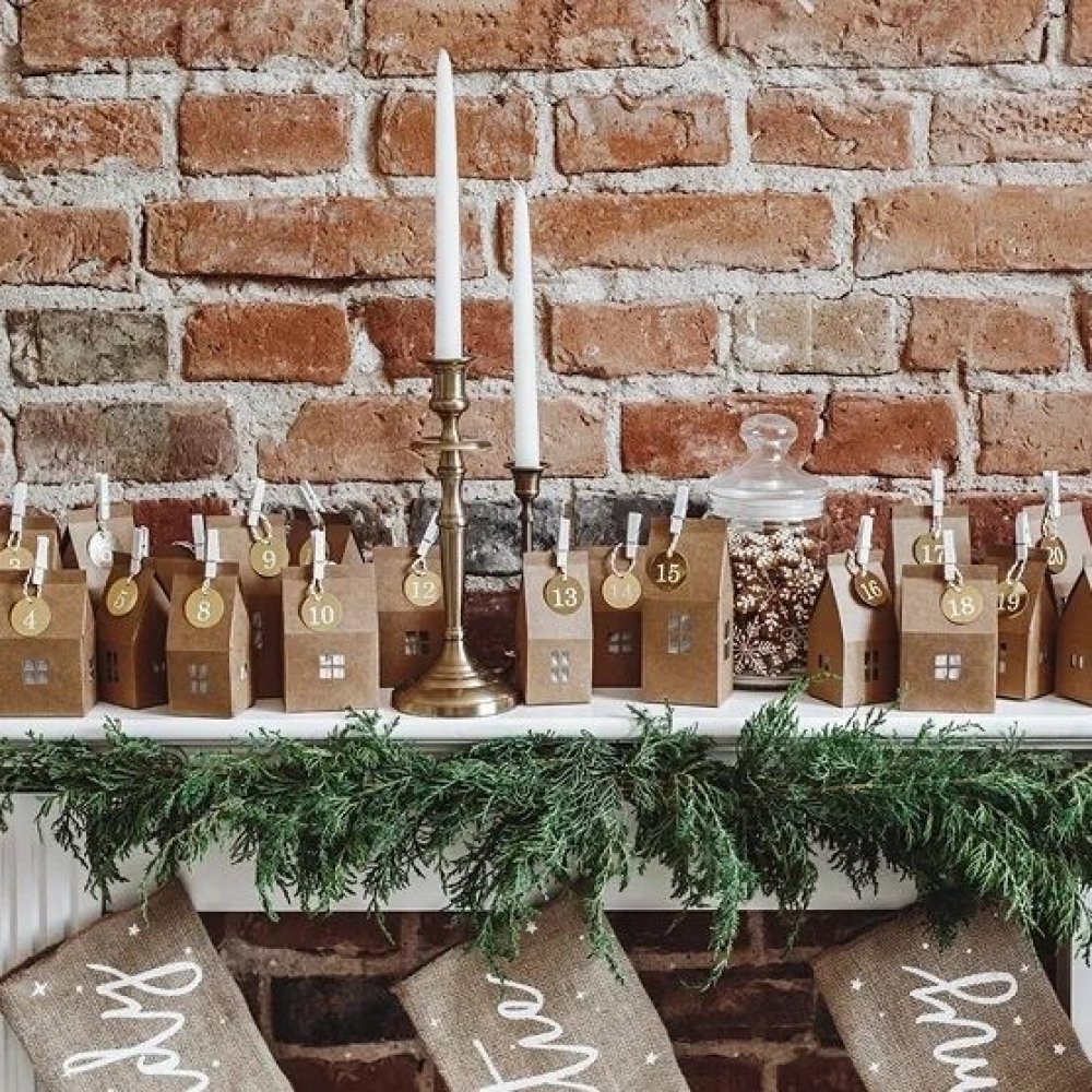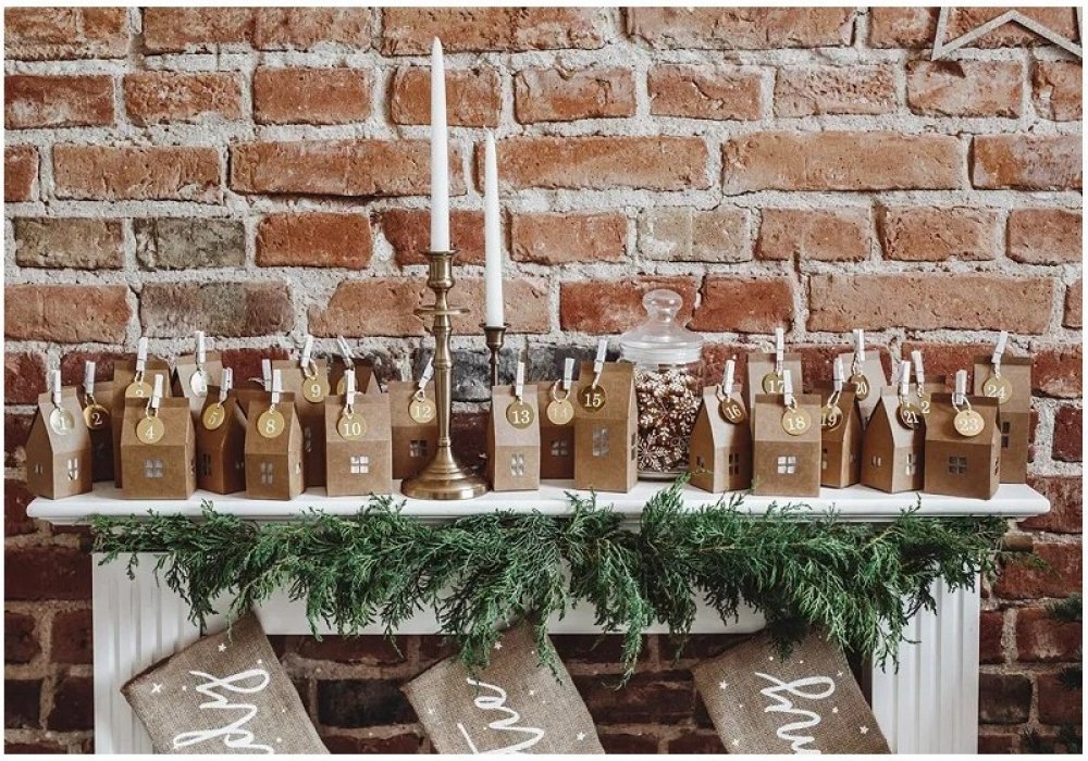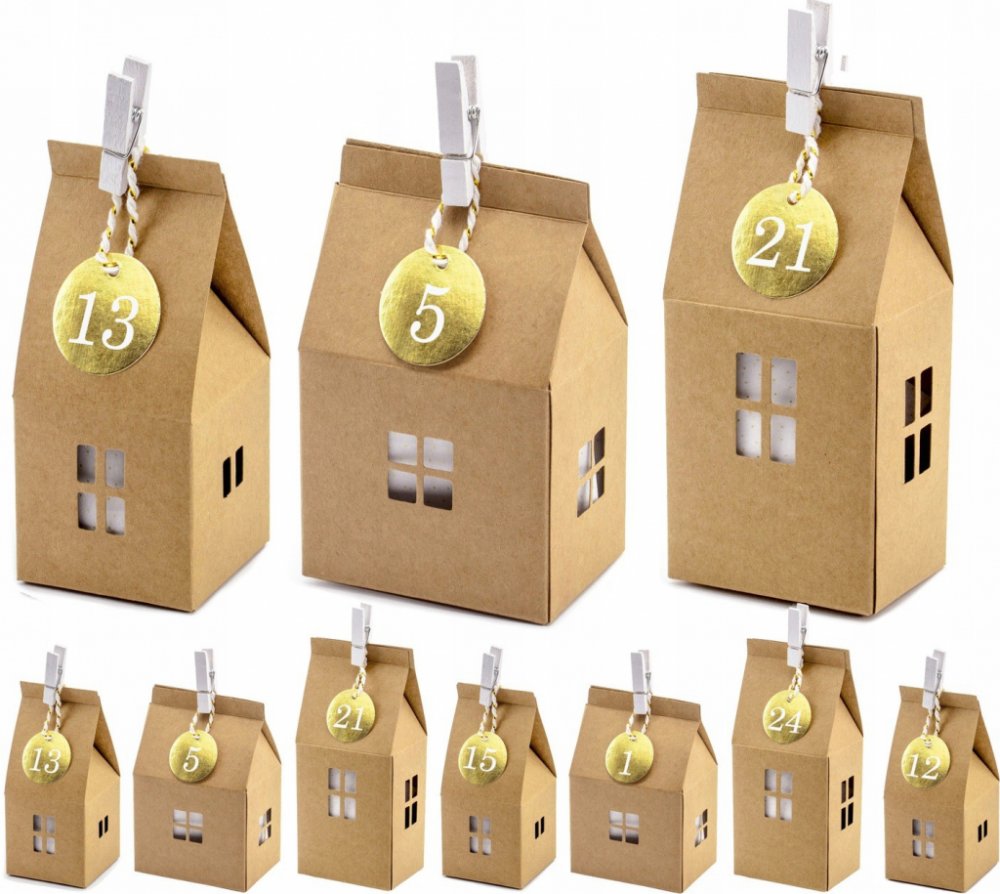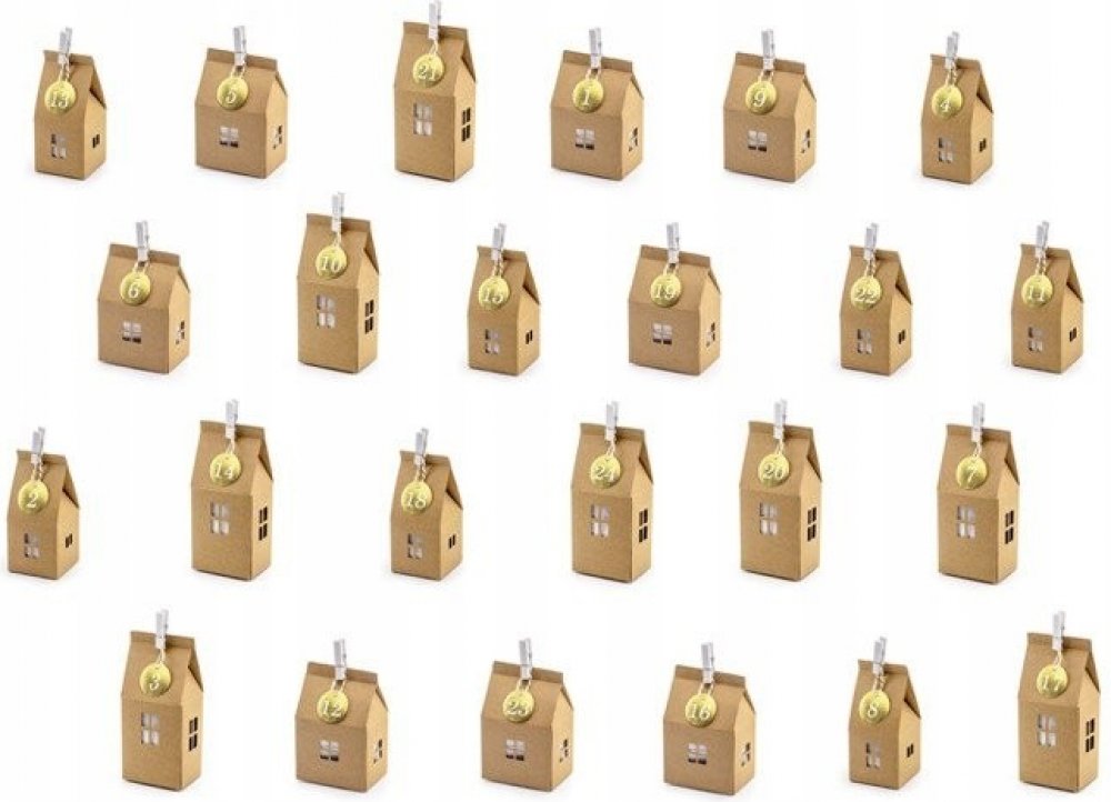 Adventní kalendář z papírových domečků. Balení obsahuje 3 vzory papírových domečků v kraftové barvě (celkem 24 domečků). 8 kusů od každého designu (velikost od cca 5 x 11 x 5 cm do cca 7 x 14 x 6 cm). Dále balení obsahuje 24 dřevěných kolíků v bílé barvě (výška cca 3,5 cm), zlaté papírové visačky s bílými potištěnými čísly od 1 do 24 (průměr cca 3 cm), 24 kusů bílé šňůrky se zlatou nití (délka cca...