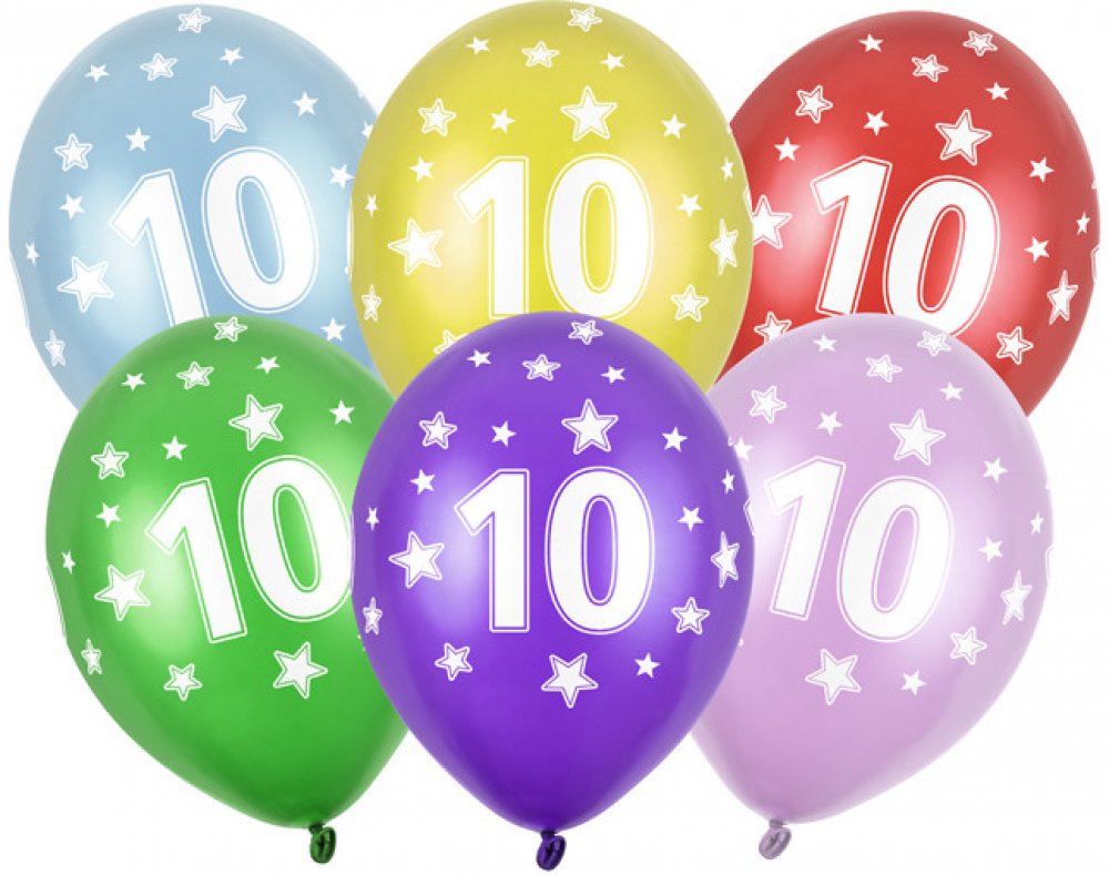 Latexový balonek s číslem 10 mix metalických barev (růžová, červená, žlutá, zelená, oranžová, světle modrá, tmavě modrá, fialová) s celoplošným bílým potiskem, velikost 30 cm.