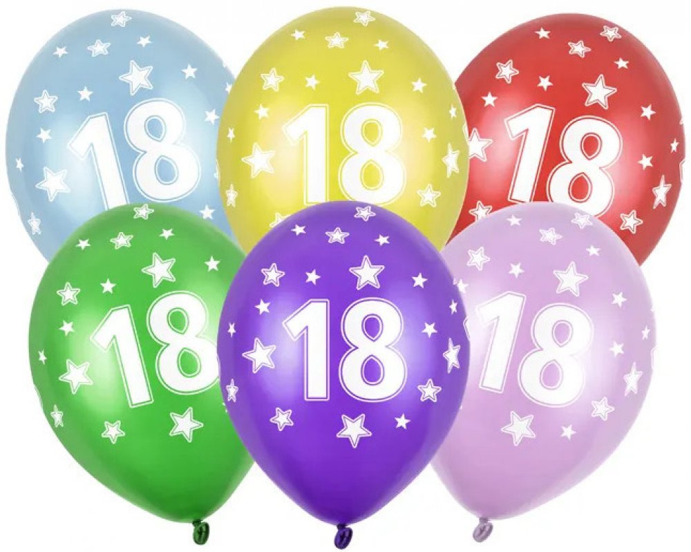 Latexový balonek s číslem 18 mix metalických barev (růžová, červená, žlutá, zelená, oranžová, světle modrá, tmavě modrá, fialová) s celoplošným bílým potiskem, velikost 30 cm.