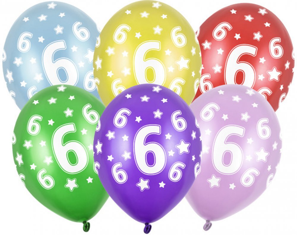 Latexový balonek s číslem 6 mix metalických barev (růžová, červená, žlutá, zelená, oranžová, světle modrá, tmavě modrá, fialová) s celoplošným bílým potiskem, velikost 30 cm.