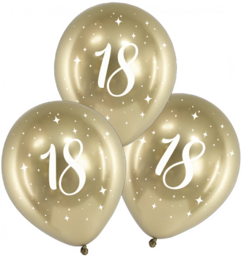 Set latexových balonků s číslem 18 v chromově zlaté barvě s bílým potiskem, velikost 30 cm, v balení 6 ks.