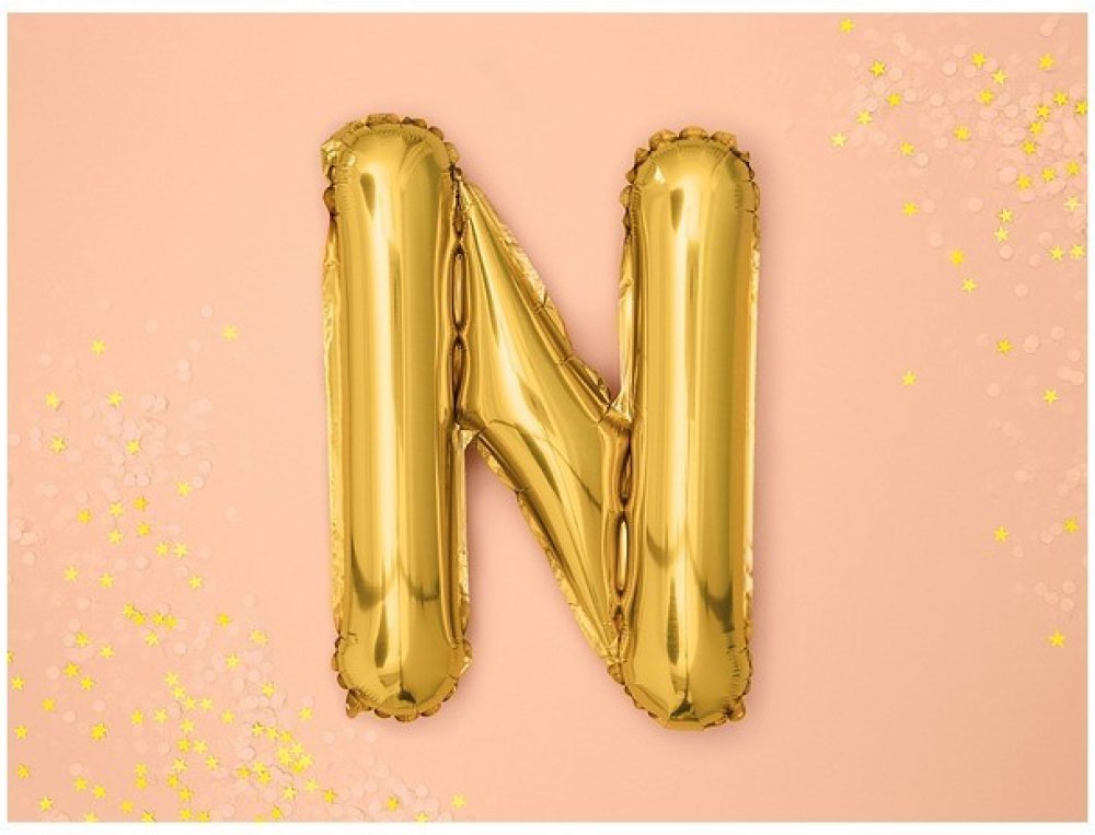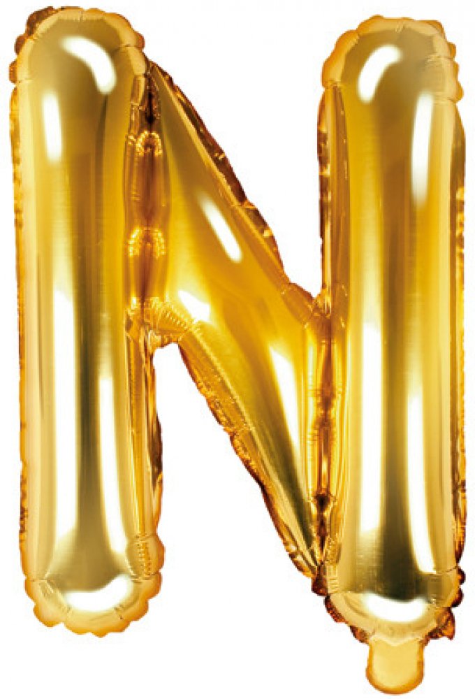 Krásný fóliový zlatý balónek písmeno "N". Písmena jsou vhodná k sestavení iniciálů novomanželů či k sestavení příjmení a krátkých vzkazů. Písmena můžete zavěsit za novomanžele ve svatebních prostorách nebo s nimi vyzdobit například fotokoutek.