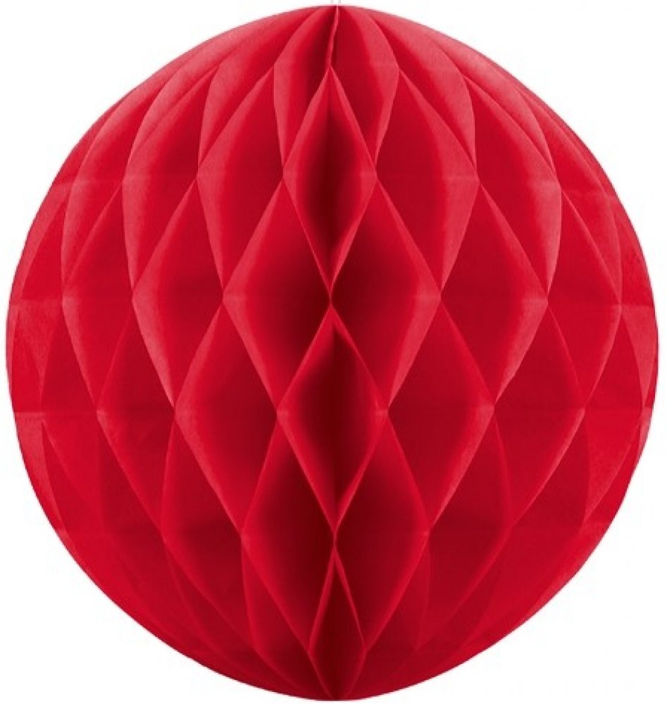 Dekorační honeycomb koule červené barvy je vyrobena z hedvábného papíru s mnoha vrstvami, který při roztažení připomíná včelí plástve. Koule je opatřena poutkem pro snadné zavěšení.