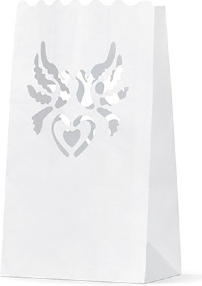 Lucerny na svíčky vyrobené z nehořlavého bílého papíru ve tvaru sáčků s vykrojeným srdcem a holubicemi, velikost 15 x 9 x 26 cm, v balení 10 ks.