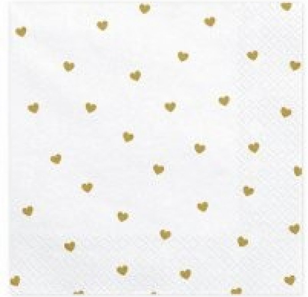 Papírové ubrousky v bílé barvě se zlatými srdíčky. Velikost 33x33cm, složené 16.5x16.5cm. Balení obsahuje 20ks ubrousků.