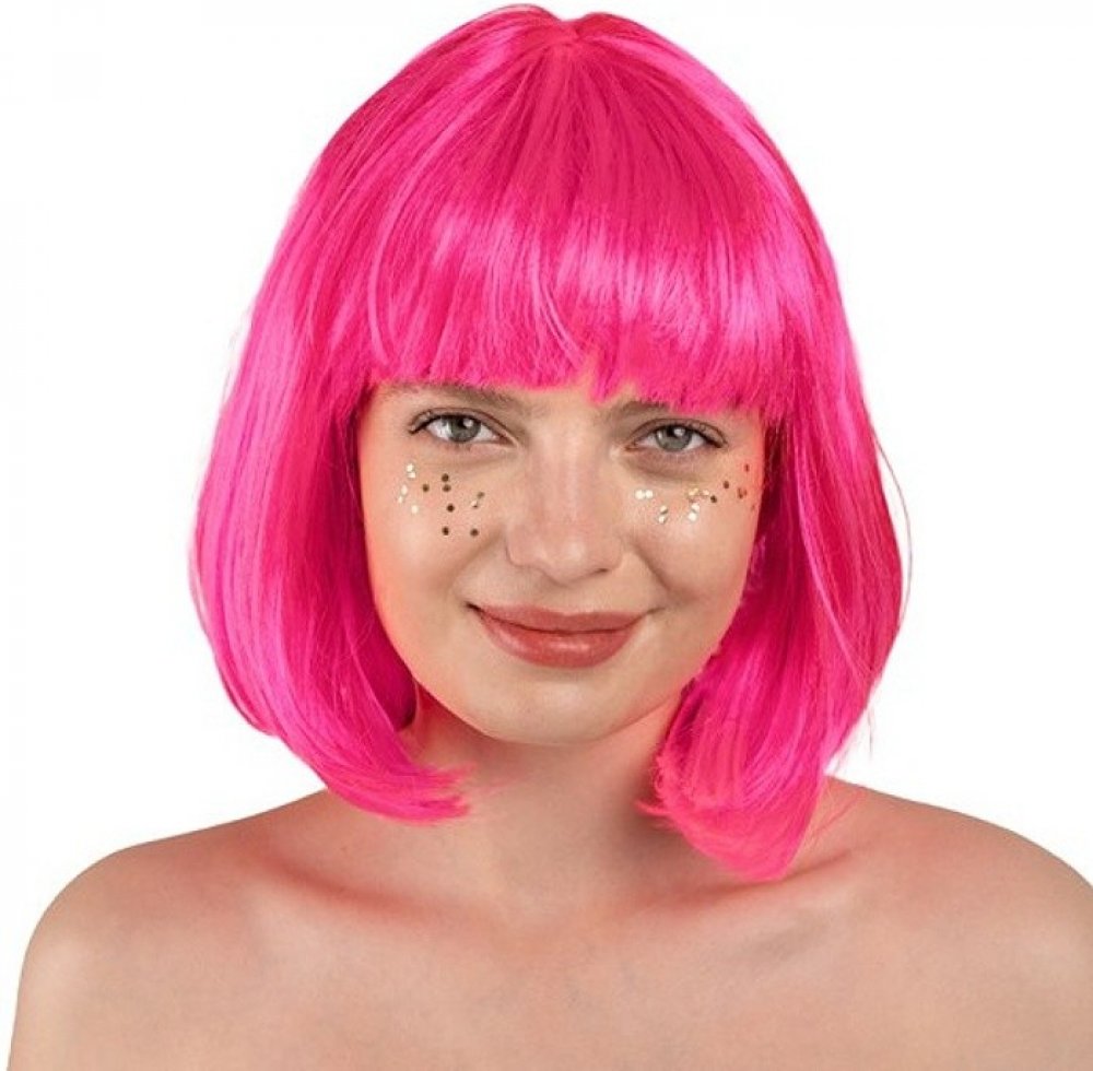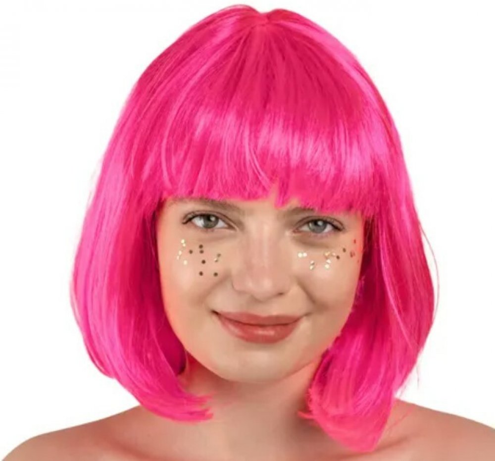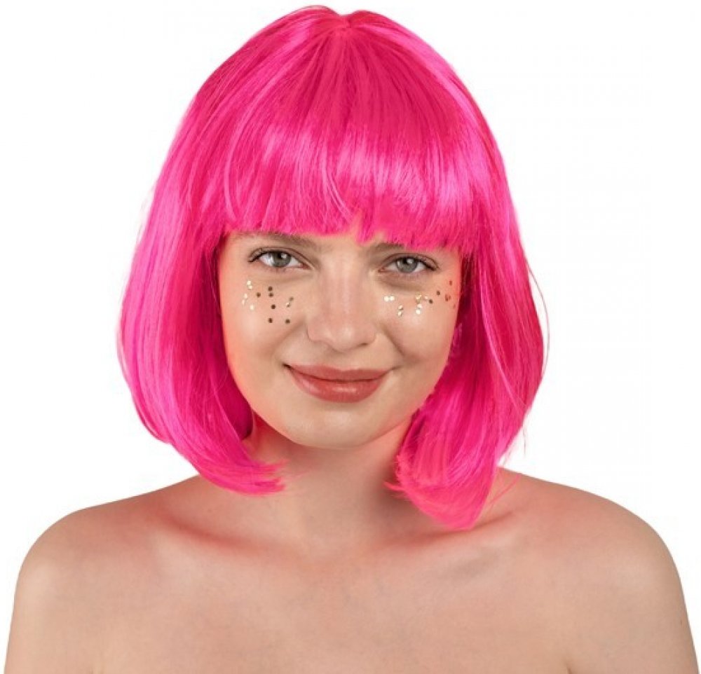 Zářivě neonově růžová paruka vhodná na karneval nebo jiné tématické večírky. Paruka je střižená do mikáda a má uhlazený střih s ofinou. Velikost: univerzální