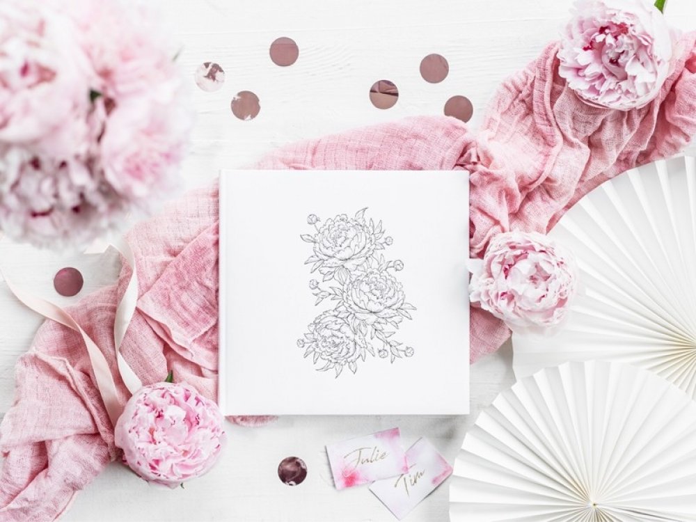 PartyDeco Svatební kniha hostů bílá reliéf pivoňky