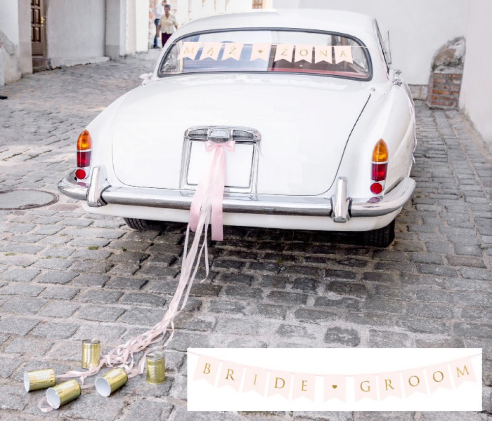 - jako alternativu k polskému nápisu jsme k sadě přidali růžový banner Bride ♥ Groom, produkt udělej si sám, rozměry po sestavení: délka 155 cm, výška 15 cm