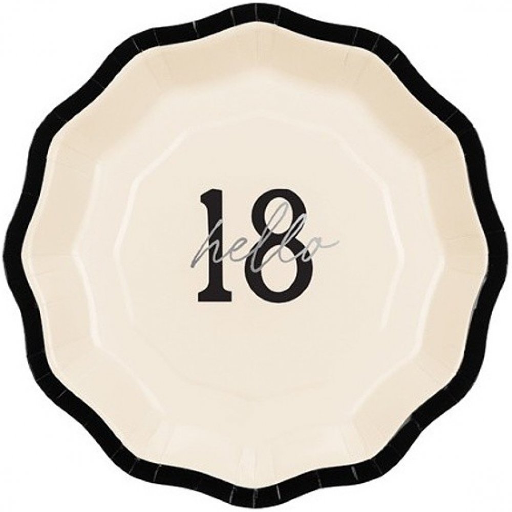 Papírové talířky ve smetanové barvě s černým okrajem, stříbrným nápisem Hello (ahoj) a černým číslem 18, velikost 18 cm, v balení 6 ks.