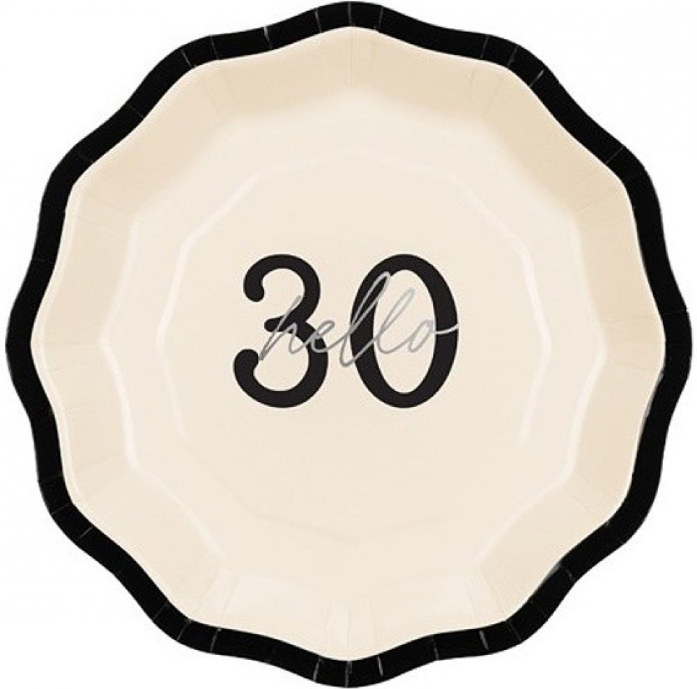 Papírové talířky ve smetanové barvě s černým okrajem, stříbrným nápisem Hello (ahoj) a černým číslem 30, velikost 18 cm, v balení 6 ks.