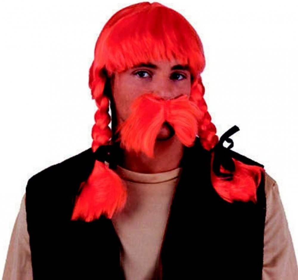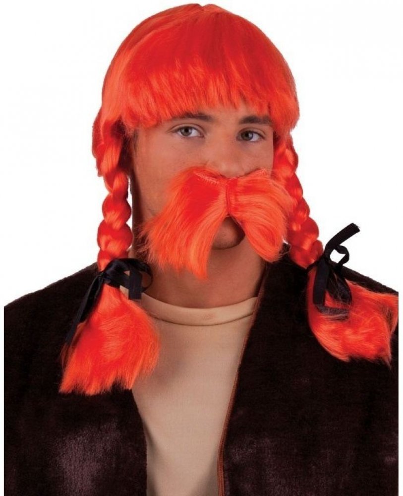 Karnevalová oranžová paruka s copy a černými stužkami a knír