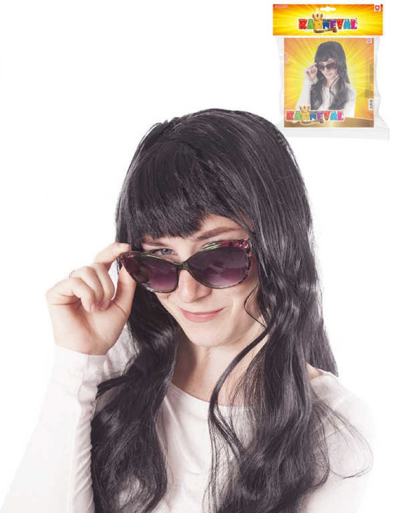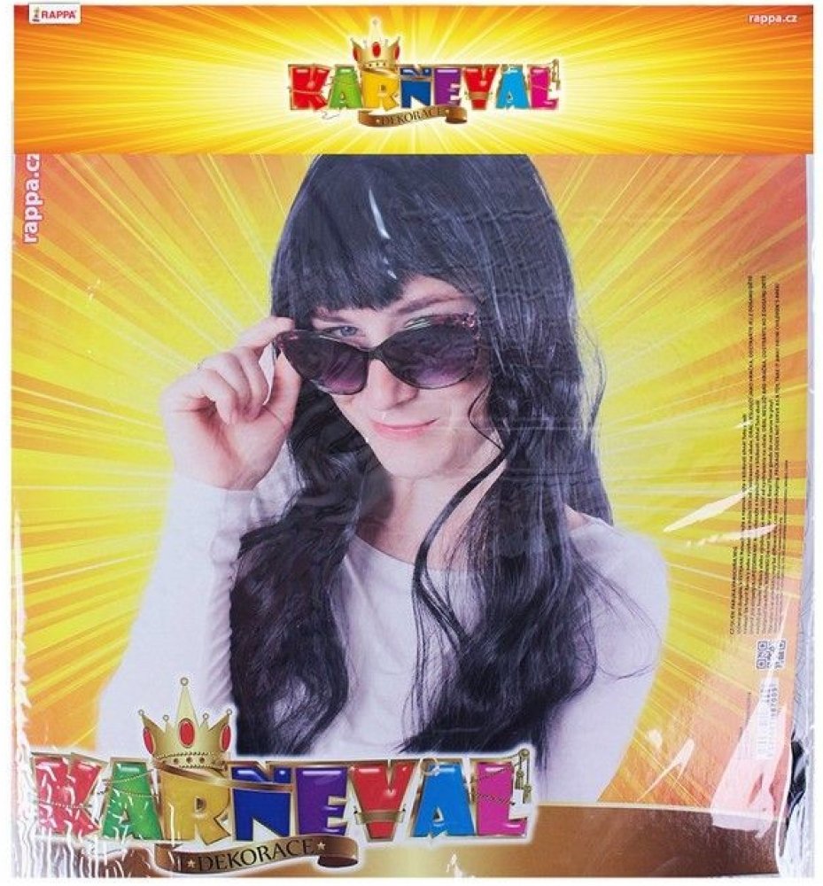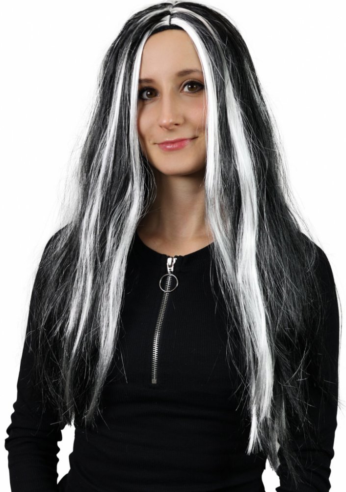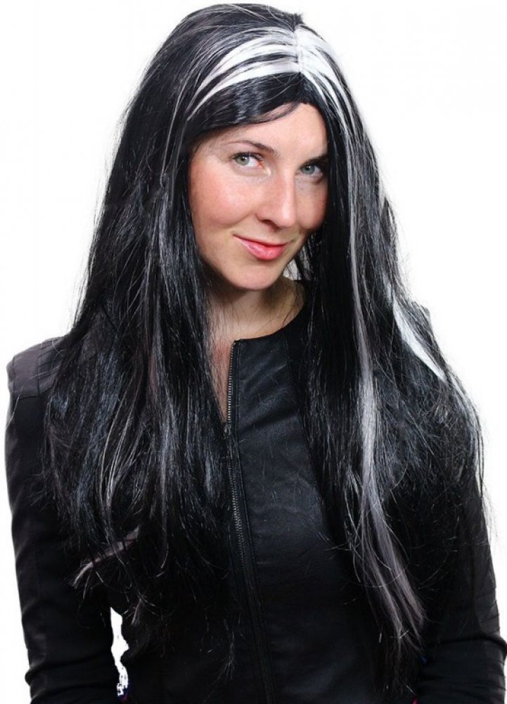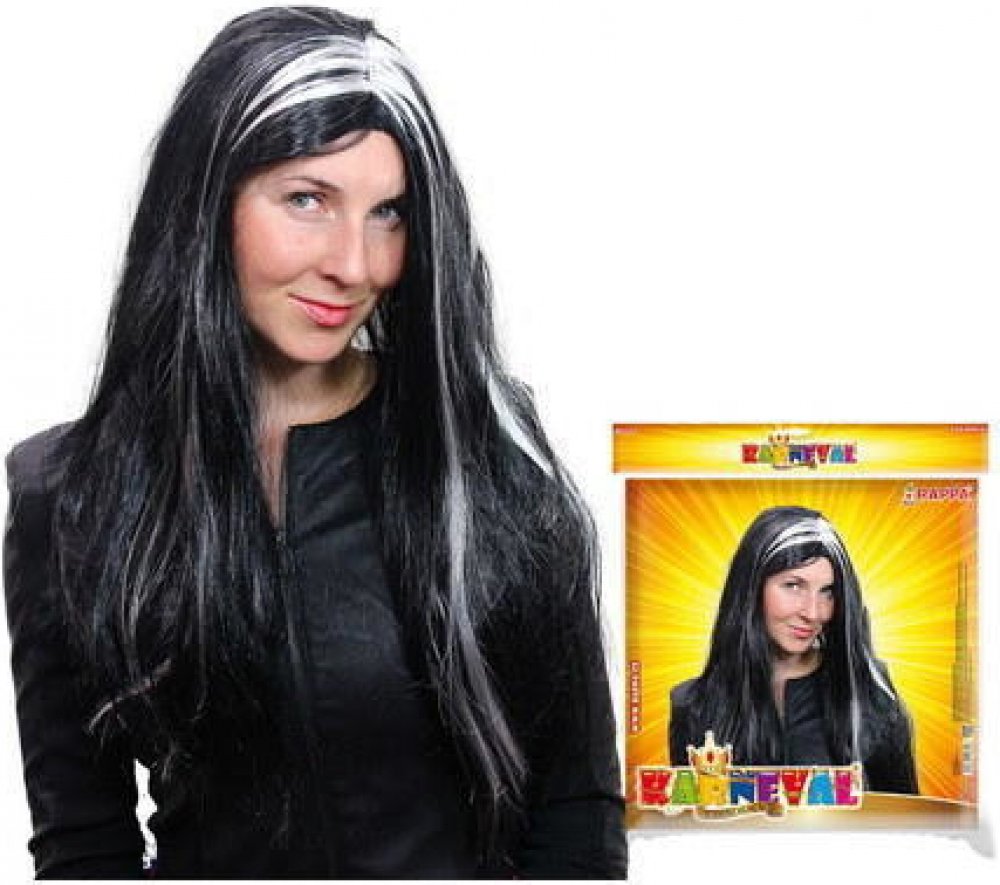 Karnevalová paruka pro dospělé v motivu čarodějnice. Paruká má dlouhé černé vlasy a je dekorována stříbrným melírem.