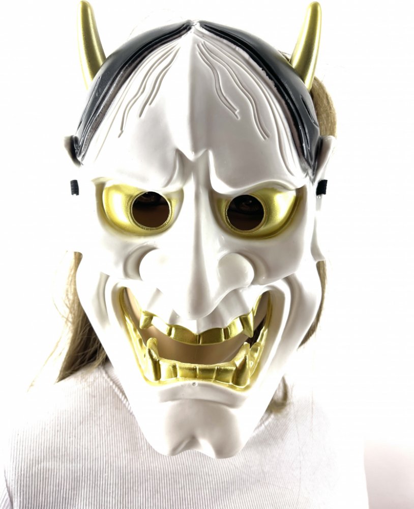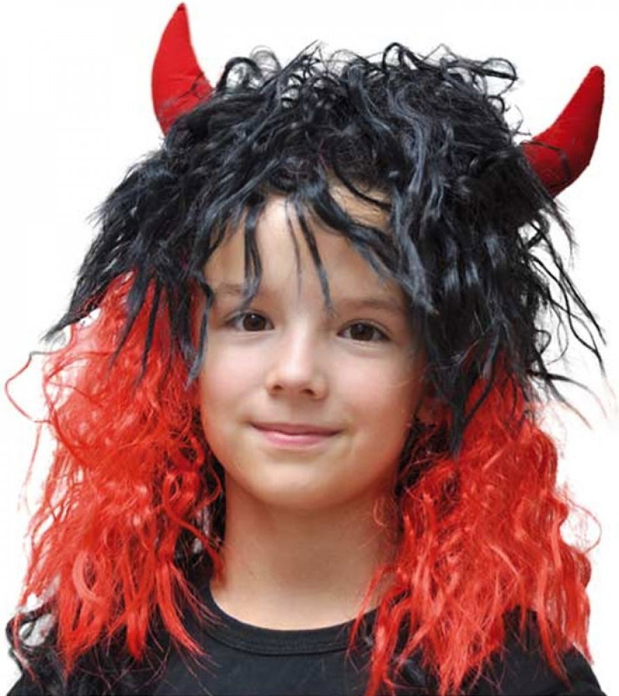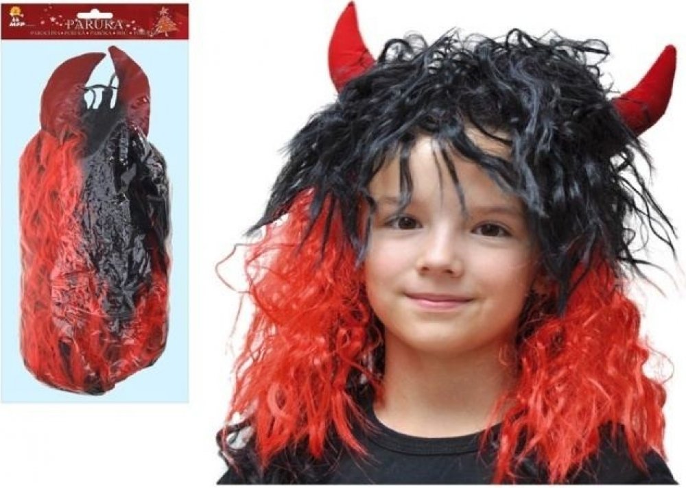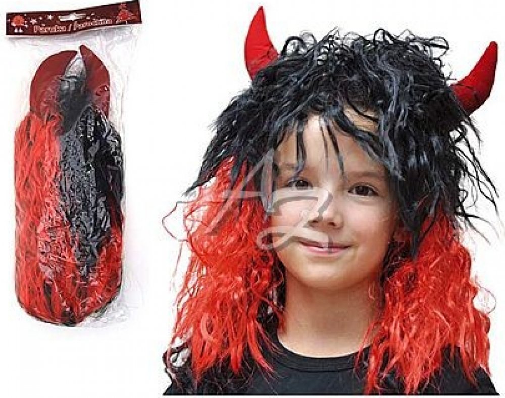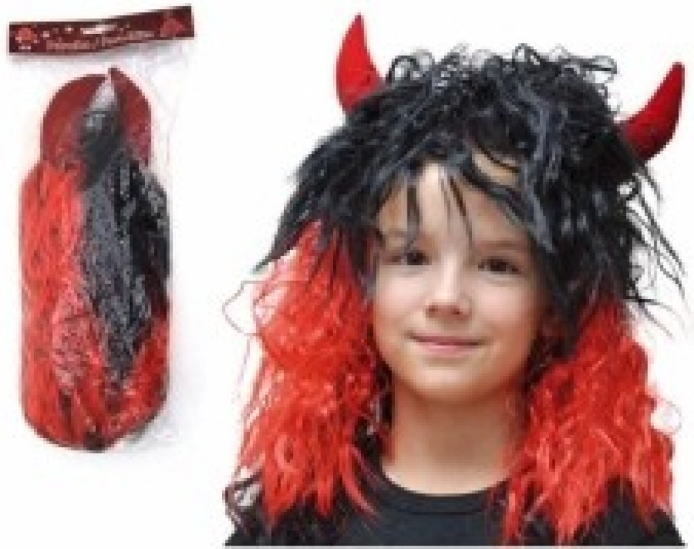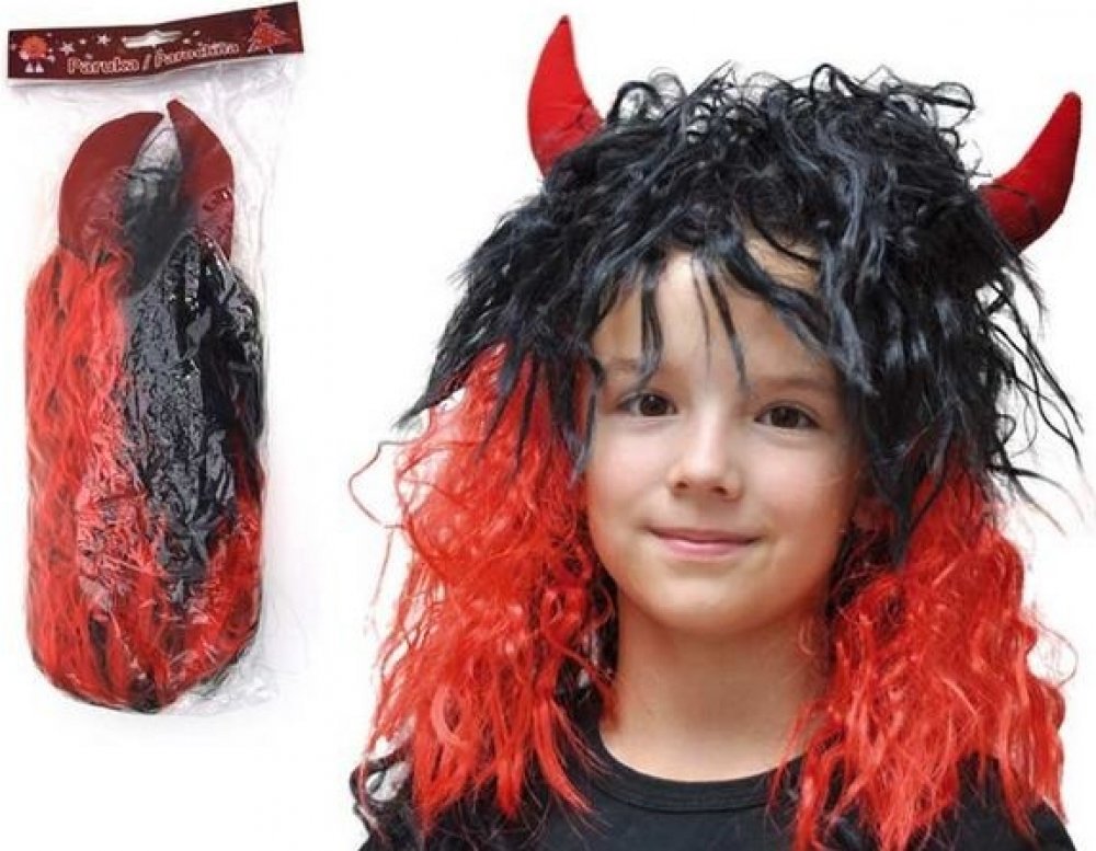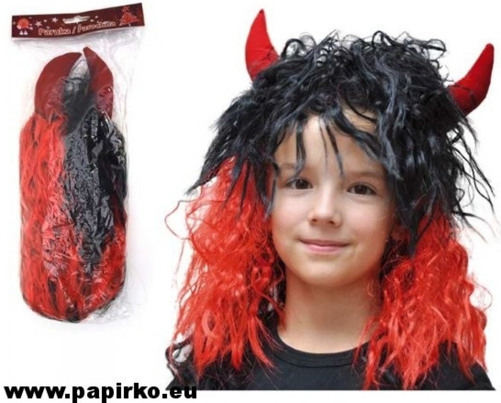 Čertovská paruka s rohy a dlouhými červenými vlasy. Na vniřní straně paruky je prodyšná sítka, díky tomu se Vám nebude potit v masce hlava. Okraj paruky je opatřený gumičkou, aby maska dobře přilnula a nepadala.