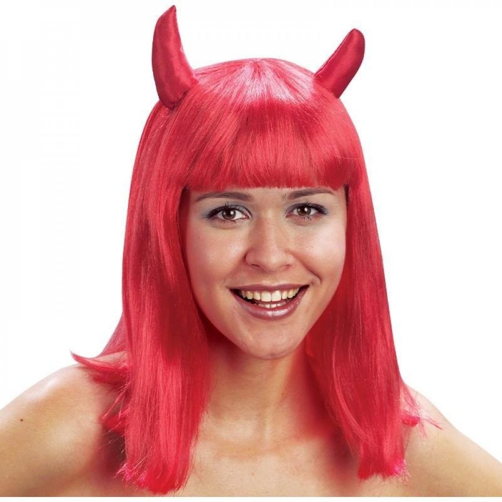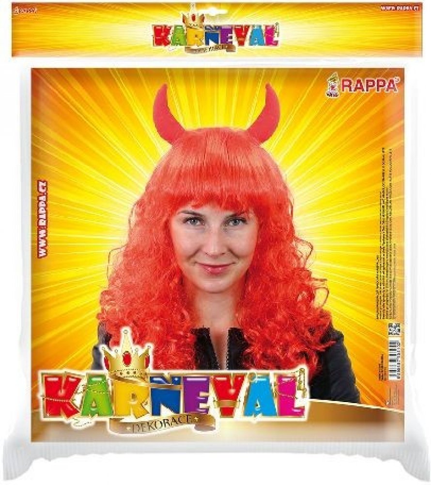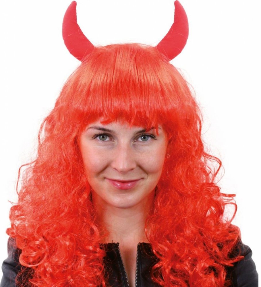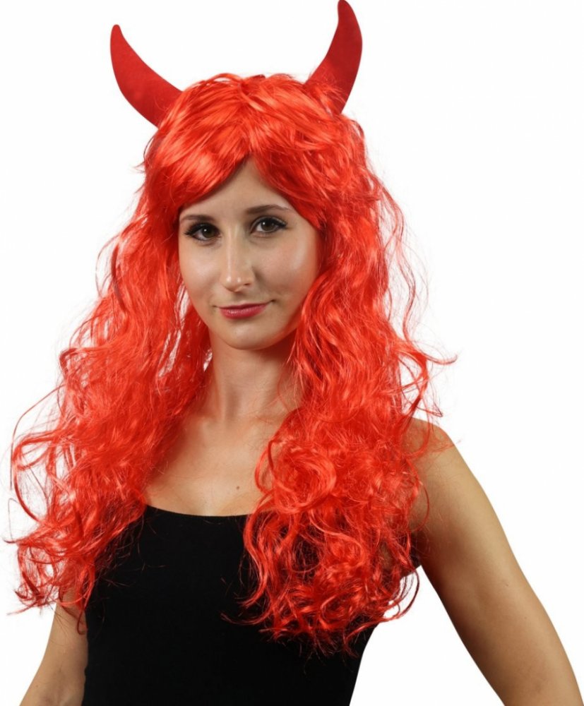 Karnevalová paruka s motivem čertice. Paruka má dlouhé červené vlasy, krátkou ofinu a je dekorována čertími růžky. Skvělý doplněk ke kostýmu!