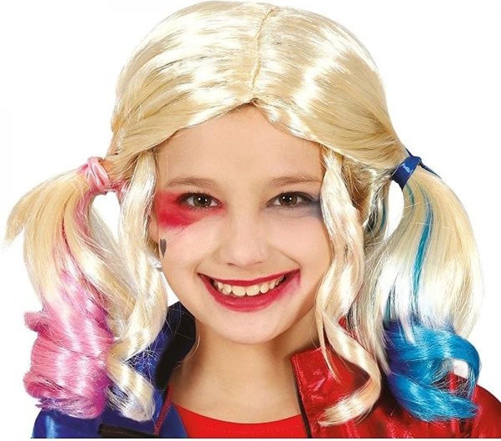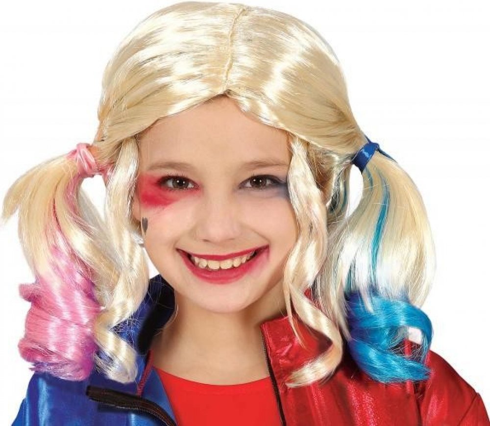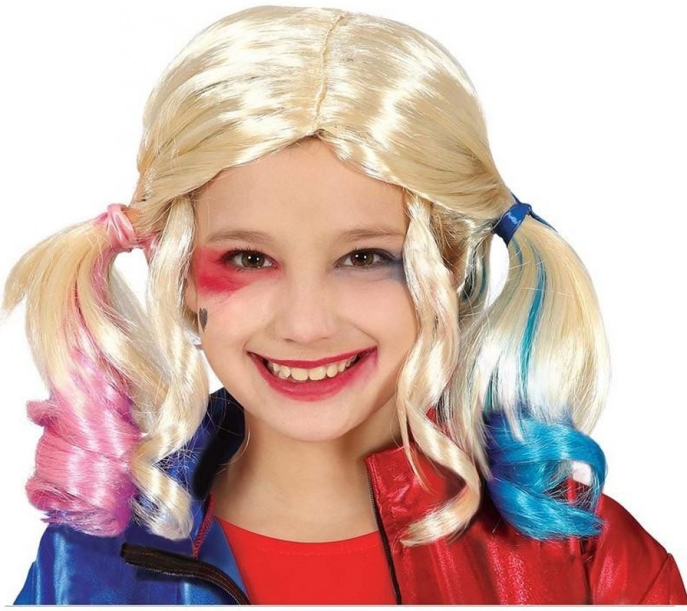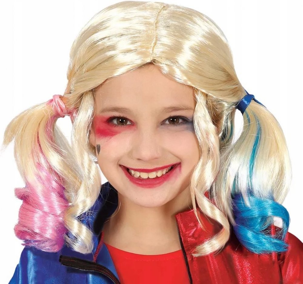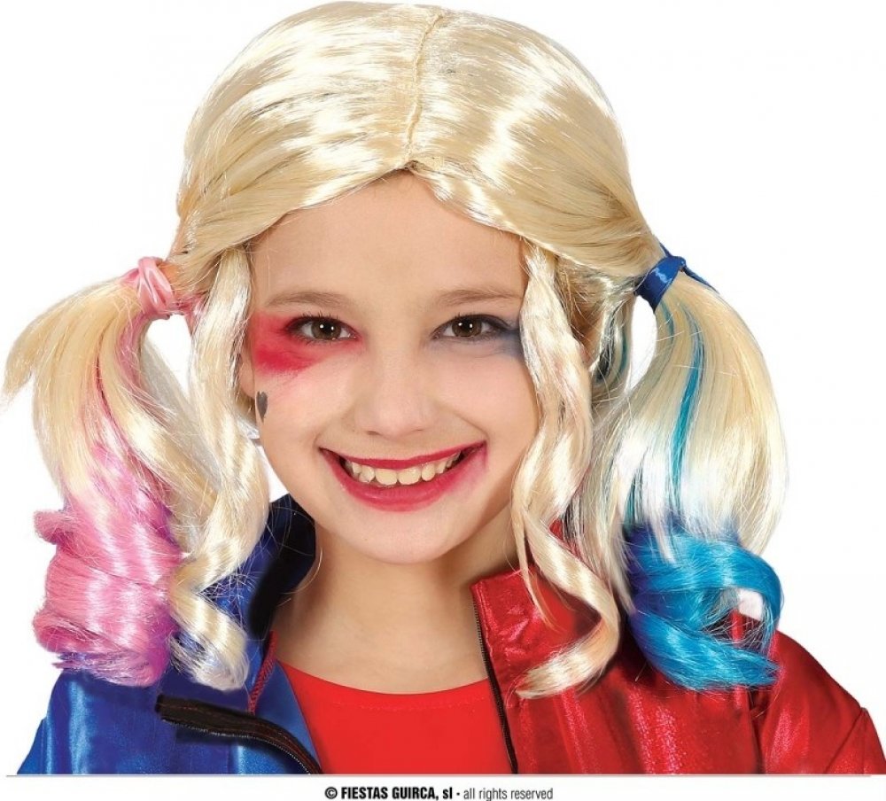 Paruka v blond barvě, pramínky v kýtách, v růžové barvě z jedné a modré z druhé strany paruky.