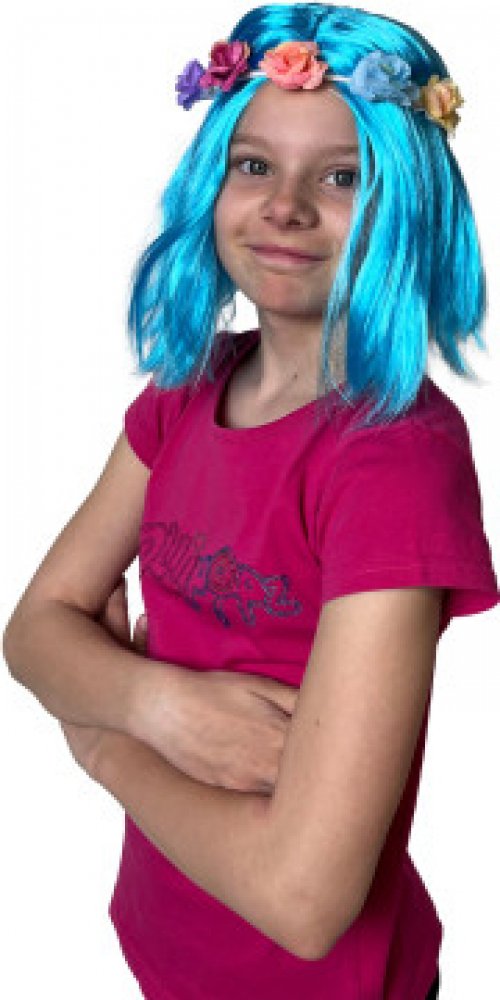 Umělé vlasy jsou rozpuštěné a součástí je čelenka na gumu s růžemi.