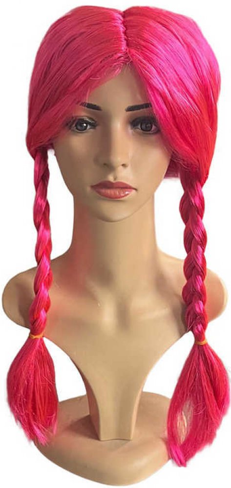 Umělé vlasy jsou učesané do dvou copů s gumičkami.
