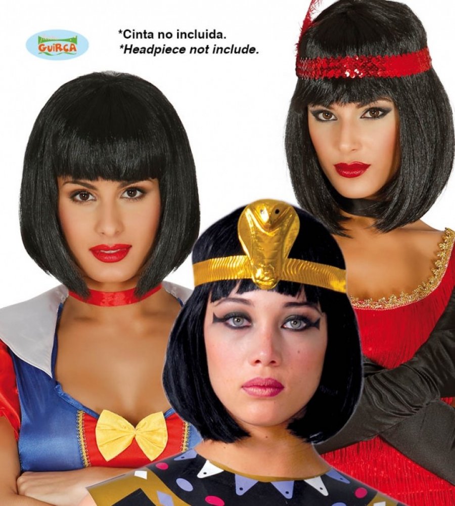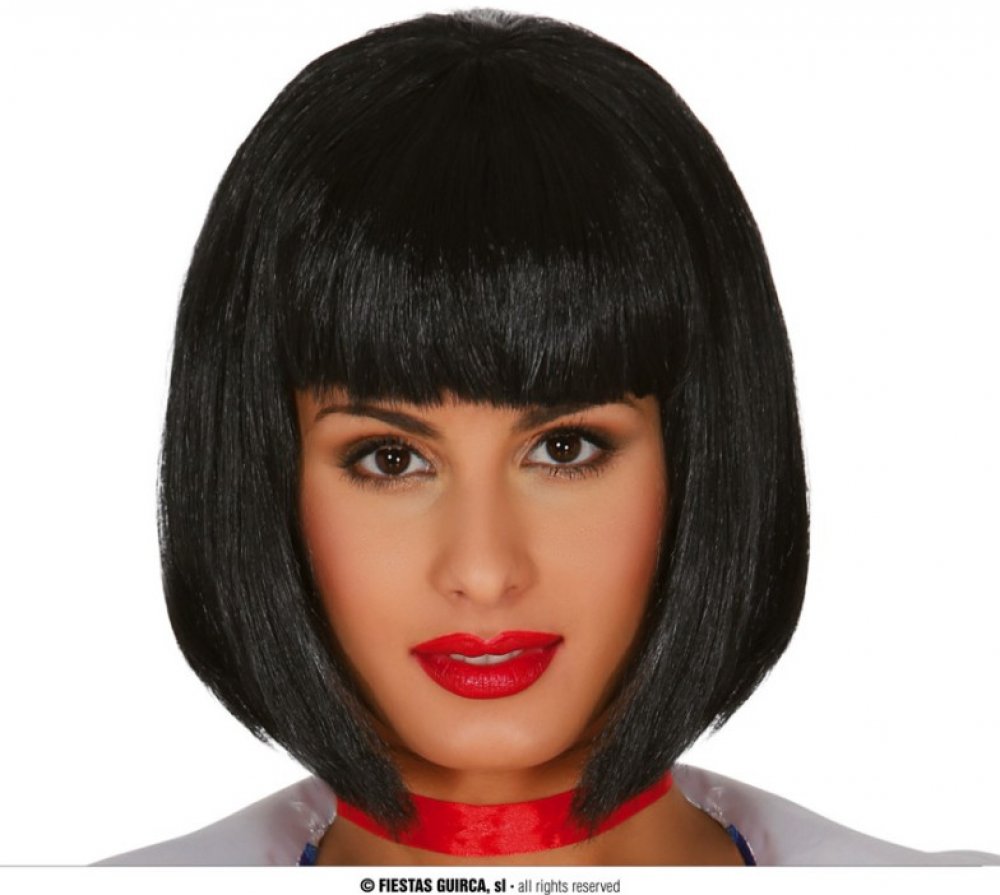 Černá krátká paruka, vhodná k doplnění čelenkou a pod. Čelenka není součástí.
