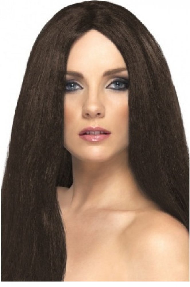 Dámská paruka v hnědé barvě skvěle doladí různé kostýmy. Tyto rovné dlouhé vlasy můžete využít například k hippie kostýmu.