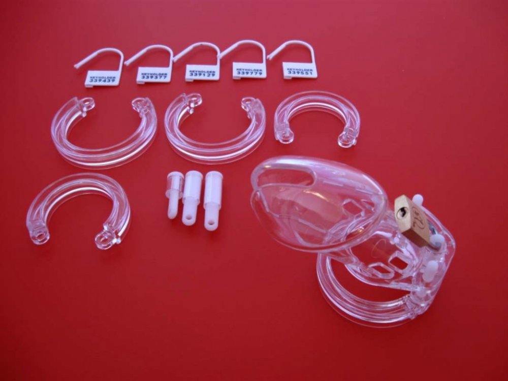 Obsah balení : 1ks klec na penis, 5ks kroužek, 4ks spojovací kolík, 5ks plastový zámek, 1ks zámek s klíči.