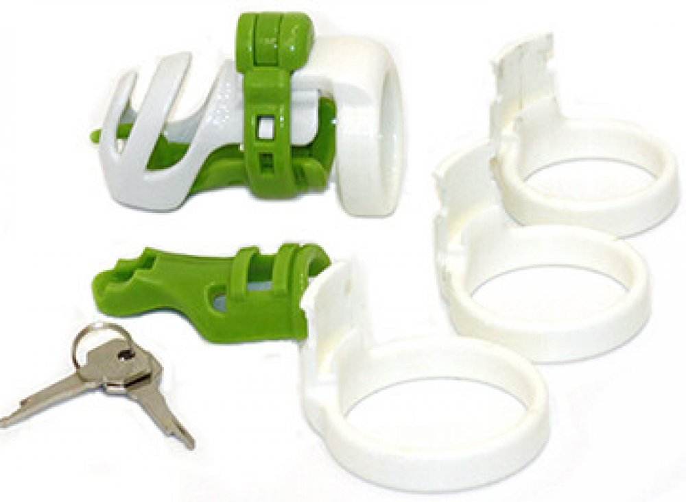 Mužský pás Evotion je další zajímavou variantou mužských pásů cudnosti. Pás je vhodný spíše pro muže s menším obvodem penisu. Pás slouží k omezení erekce. Klícka Evotion se skládá z rozkládacích dílů - horního a dolního a dvou obepínacíh kroužků, kroužek na varlata a vestavný zámek. Klícky jsou dvoubarevné. Spodní díly jsou ve dvou různých provedeních: jeden hladký a jeden s háčkem pro muže, kteří mají PA piercing.Klícky jsou ve dvou velikostech. Liší se jen o 1cm na délku.Barevná provedení klícek: normální velikost: bílo-zelená, červeno-černá a průhledná. malá velikost: bílo-zelená vnitřní průměry kroužků: 38, 43, 48 a 52 mmrozměry klícky: délka 7,7 cm, šířka 3,1 cm rozměry menší klícky: 6,7 cm, šířka 3,1cm Balení obsahuje:4 kroužků různých velikostí1 klícku na penis (1 vrchní díl, 2 spodní díly, 2 obepínací díly)1 zámek se 2 klíči Čištění: pro vyčistění používejte pouze mýdlo a velmi jemný kartáček, nepoužívejte čistící prostředky určené pro domácnost ani žádné jiné desinfekční prostředky, aby nedošlo k narušení plastového povrchu. Nasazování: pro příjemnější nasazování klícky je vhodnější používat lubrikační gel či dětský olejíček, klícka se nasazuje na penis v klidovém stavu.