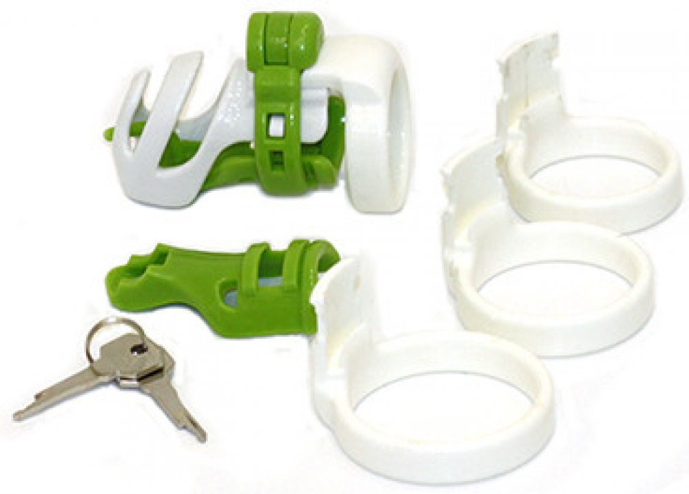 Mužský pás Evotion je další zajímavou variantou mužských pásů cudnosti. Pás je vhodný spíše pro muže s menším obvodem penisu. Pás slouží k omezení erekce. Klícka Evotion se skládá z rozkládacích dílů - horního a dolního a dvou obepínacíh kroužků, kroužek na varlata a vestavný zámek. Klícky jsou dvoubarevné. Spodní díly jsou ve dvou různých provedeních: jeden hladký a jeden s háčkem pro muže, kteří mají PA piercing.Klícky jsou ve dvou velikostech. Liší se jen o 1cm na délku.Barevná provedení klícek: normální velikost: bílo-zelená, červeno-černá a průhledná. malá velikost: bílo-zelená vnitřní průměry kroužků: 38, 43, 48 a 52 mmrozměry klícky: délka 7,7 cm, šířka 3,1 cm rozměry menší klícky: 6,7 cm, šířka 3,1cm Balení obsahuje:4 kroužků různých velikostí1 klícku na penis (1 vrchní díl, 2 spodní díly, 2 obepínací díly)1 zámek se 2 klíči Čištění: pro vyčistění používejte pouze mýdlo a velmi jemný kartáček, nepoužívejte čistící prostředky určené pro domácnost ani žádné jiné desinfekční prostředky, aby nedošlo k narušení plastového povrchu. Nasazování: pro příjemnější nasazování klícky je vhodnější používat lubrikační gel či dětský olejíček, klícka se nasazuje na penis v klidovém stavu.