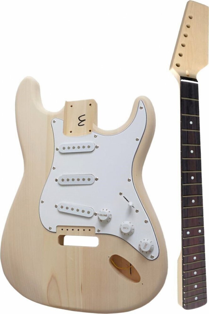 Elektrická kytara - Custom Diy Stratocaster společnosti Pasadena. Sada obsahuje všechny součásti k sestavení kompletní kvalitní elektrické kytary. Nabízí lipové tělo s přesným tvarem, krk z masivního javorového dřeva s nastavitelnou výztuží, palisandrový hmatník a hardware s niklovou povrchovou úpravou. Balení obsahuje struny a kabel.