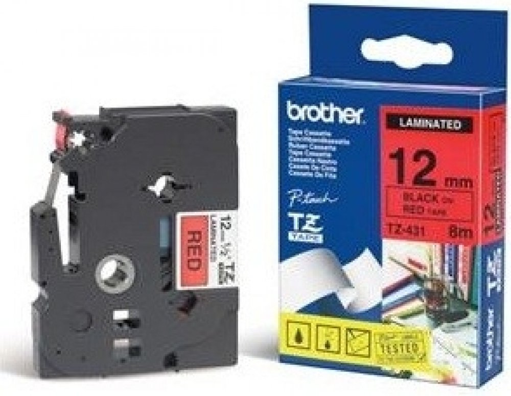 Originální páska Brother TZe-431, 12 mm, laminovaná červená páska / černý tisk, výtěžnost 8 m. Pro tiskárny Brother P-touch 18R, PT-18R, P-touch 300, PT-300, P-touch 550, PT-550, P-touch 900, PT-900, P-touch 1000, PT-1000, P-touch 1010, PT-1010, P-touch 1080, PT-1080, P-touch 1090, PT-1090, P-touch 1230PC, PT-1230PC, P-touch 1260, PT-1260, P-touch 1280, PT-1280, P-touch 1830, PT-1830, P-touch 1950, PT-1950, P-touch 2030, PT-2030, P-touch 2100, PT-2100, P-touch 2420PC, PT-2420PC, P-touch 2430PC, PT-2430PC, P-touch 2450DX, PT-2450DX, P-touch 2460, PT-2460, P-touch 2470, PT-2470, P-touch 2480, PT-2480, P-touch 2500PC, PT-2500PC, P-touch 2700, PT-2700, P-touch 2730, PT-2730, P-touch 3600, PT-3600, P-touch 7100, PT-7100, P-touch 7500, PT-7500, P-touch 7600, PT-7600, P-touch 9200DX, PT-9200DX, P-touch 9200PC, PT-9200PC, P-touch 9400, PT-9400, P-touch 9500PC, PT-9500PC, P-touch 9600, PT-9600, P-touch 9700PC, PT-9700PC, P-touch 9800PCN, PT-9800PCN, P-touch D200, PT-D200, P-touch D200BW, PT-D200BW, P-touch D200VP, PT-D200VP, P-touch D210, PT-D210, P-touch D210VP, PT-D210VP, P-touch D400, PT-D400, P-touch D410, PT-D410, P-touch D410VP, PT-D410VP, P-touch D450, PT-D450, P-touch D450VP, PT-D450VP, P-touch D600, PT-D600, P-touch D600VP, PT-D600VP, P-touch D800W, PT-D800W, P-touch E100, PT-E100, P-touch E100VP, PT-E100VP, P-touch E110, PT-E110, P-touch E110VP, PT-E110VP, P-touch E300, PT-E300, P-touch E300VP, PT-E300VP, P-touch E550W, PT-E550W, P-touch E550WSP, PT-E550WSP, P-touch E550WVP, PT-E550WVP, P-touch E720BT, P-touch E920BT, P-touch GL200, PT-GL200, P-touch H75, PT-H75, P-touch H100, PT-H100, P-touch H105, PT-H105, P-touch H105WB, PT-H105WB, P-touch H107, PT-H107, P-touch H110, PT-H110, P-touch H300, PT-H300, P-touch H500, PT-H500, P-touch P700, PT-P700, P-touch P750TDI, PT-P750TDI, P-touch P750W, PT-P750W, P-touch P900W, PT-P900W, P-touch P900Wc, PT-P900Wc, P-touch P950NW, PT-P950NW, PT-P300BT, PT-P710BT, PT-P910BT
