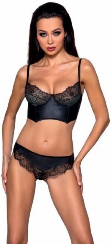 Na dotek jemná koženková látka patří ke stálicím moderních trendů a její drsnější design milují i fanoušci BDSM hrátek. Pevnější materiál sice nepruží tolik jako prádlo s větším podílem elastanu, ale komplet se snadno obléká, neškrábe kůži a zpříjemňuje nošení. Dominantní styl kompletu zjemňují košíčky podprsenky a lemy na kalhotkách z luxusní krajky.