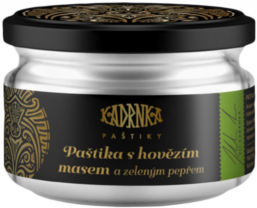 Domácí hrubozrnná paštika s naturální chutí hovězího masa doplněná lehce štiplavou pálivostí při rozkousnutí kuličky zeleného pepře. Skvěle vynikne s tmavým křupavým pečivem. Jedinečný chuťový zážitek od šéfkuchaře Vítka Kadrnky, bratra Jindřicha Kadrnky, známého vinaře z Březí nedaleko Pálavských kopců.