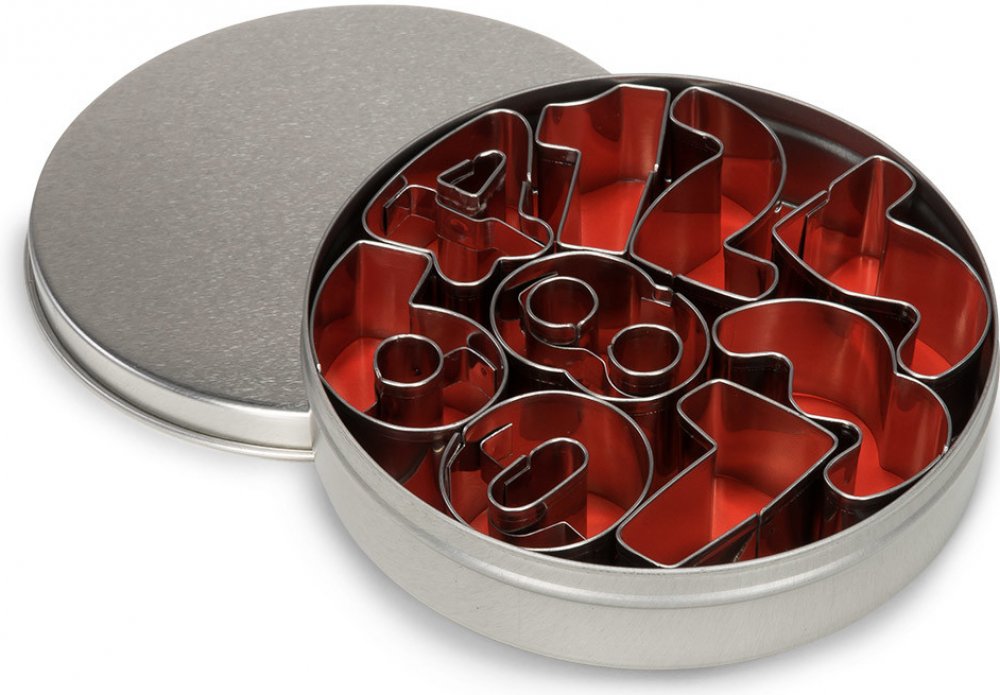 Sada kovových vykrajovačů ve tvaru číslic obsahuje čísla 0-8 (číslice 6 je stejná, jako číslice 9).