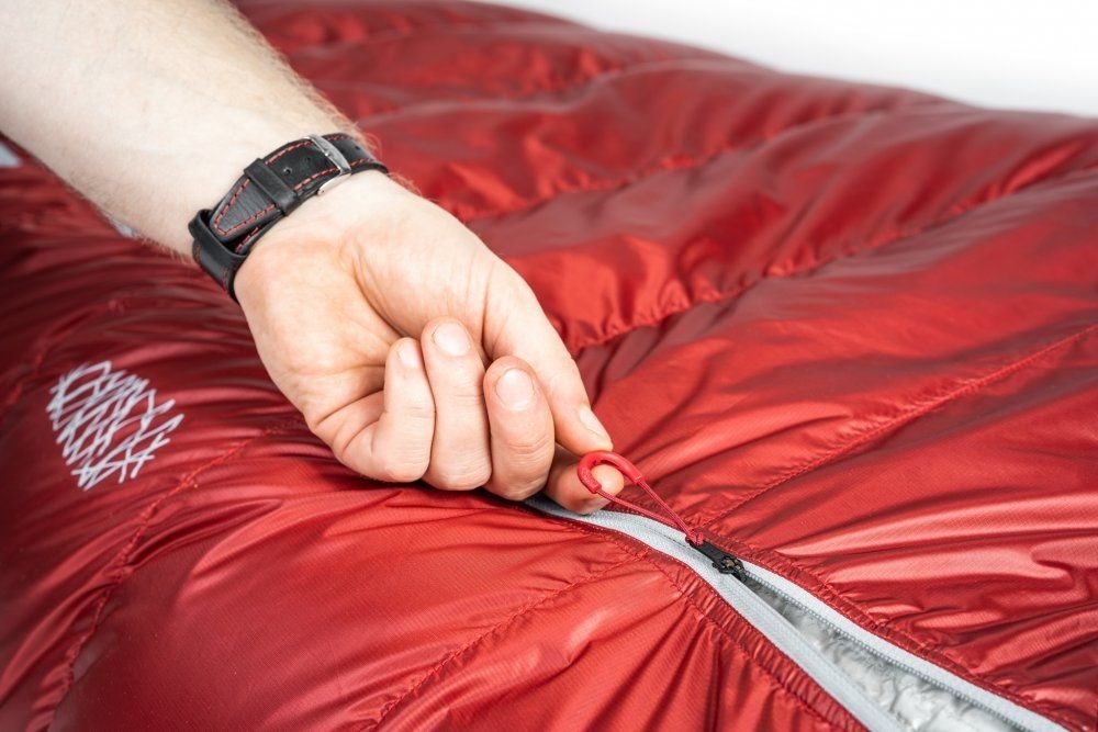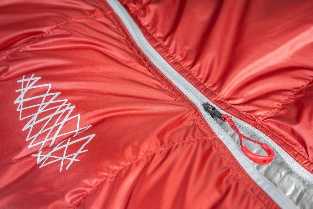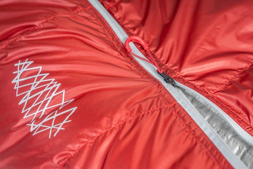 Celý hlavní zip je samozřejmě podložený peřím vyplněnou izolačné légou, aby skrz něj neunikalo drahocenné teplo. Díky konstrukci s rovným zipem je celé zateplení efektivnější a používání zipu jednodušší. Kolem ramen je pak další zateplovací léga, stahovací, konkstruovaná tak, aby nebylo potřeba žádných suchých zipů nebo patentků.