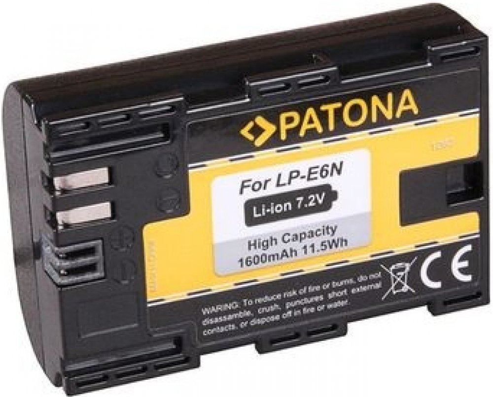 Zásadní vlastnosti baterie pro fotoaparát PATONA pro Canon LP-E6/LP-E6N 1600mAh Li-Ion 7,2V Alternativní baterie PATONA spolehlivě zajistí náhradu za původní akumulátor Jde o Canon LP-E6N baterii 7,2V akumulátor se může pochlubit kapacitou 1,6 Ah S náhradní porcí energie se vyhnete situaci, že byste snímek nezachytili kvůli vybité baterii Nabízená baterie pro fotoaparát je spolehlivým řešením Tvoří ji Li-Ion článek Baterie PATONA je připravena na 1200 nabíjecích cyklů Baterie pro fotoaparát si zaslouží péči Abyste baterii pro fotoaparát udrželi funkční co nejdelší dobu, dodržujte správné skladování a věnujte jí péči. Baterii pro fotoaparát PATONA nedoporučujeme odkládat zcela vybitou, protože by mohla začít ztrácet kapacitu. Rovněž ji není vhodné vystavovat ostrému slunci, teplotám přesahujícím 60 °C, ani teplotám pod bodem mrazu. Akumulátor chraňte také před pády, vlhkostí a před chemickými prostředky. Canon Model: