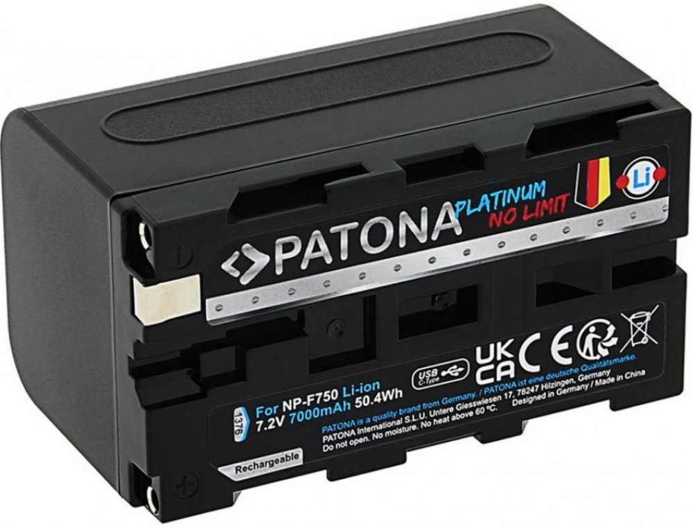 Zásadní vlastnosti produktu PATONA baterie pro Sony NP-F750/F770/F950 7000mAh Li-Ion Platinum USB-C nabíjení Baterie pro kameru Sony je důležitým vybavením pro bezproblémový provoz kamery Není na škodu brát si rezervní baterii vždy s sebou, abyste neztratili žádný důležitý záběr Jedná se o alternativu k originální baterii Kvalita dosahuje úrovně originálního zdroje energie Obsahuje Li-Ion článek Napětí baterie pro kameru PATONA odpovídá 7,2 V Disponuje kapacitou 7 Ah Její výdrž je až 1000 nabíjecích cyklů