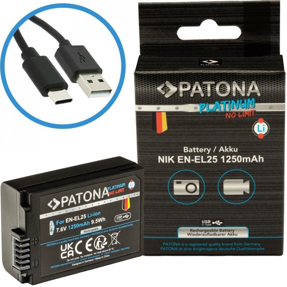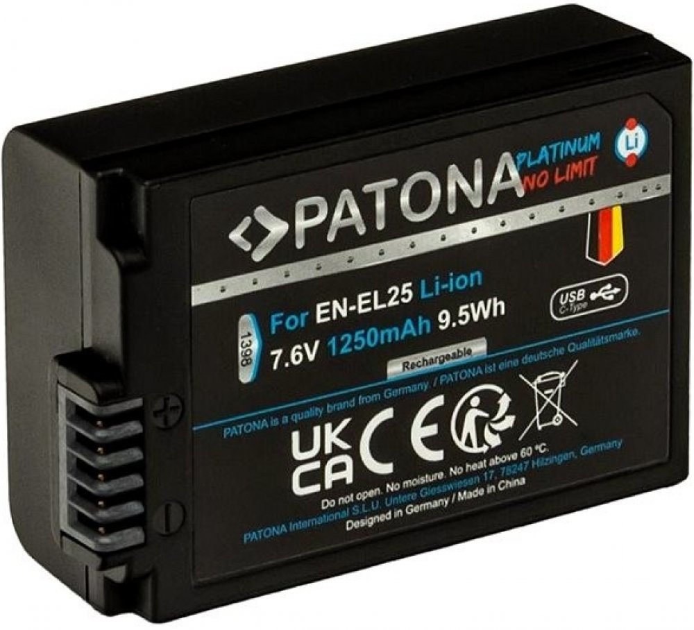 Zásadní přednosti baterie pro fotoaparát PATONA baterie pro Nikon EN-EL25 1250mAh Li-Ion Platinum USB-C nabíjení Alternativní baterie PATONA bezpečně zastoupí originální akumulátor 7,6V akumulátor disponuje kapacitou 1,25 Ah S náhradní porcí energie se vyhnete situaci, že nezachytíte požadovanou scénu kvůli slabé baterii Nabízená baterie pro fotoaparát je spolehlivým řešením Obsahuje Li-Ion článek Baterie PATONA je připravena na 1000 nabíjecích cyklů Jak udržet baterii pro fotoaparát v dobré kondici Aby byla baterie pro fotoaparát v provozu co nejdéle, je potřeba jí věnovat správnou péči. Baterii pro fotoaparát PATONA nedoporučujeme odkládat zcela vybitou, protože by mohla začít ztrácet kapacitu. Rovněž ji nevystavujte přímému slunečnímu záření, teplotám nad 60 °C, a v zimě ani mrazu. Akumulátor chraňte také před mechanickým poškozením vlhkostí a před chemickými prostředky. Nikon Model: