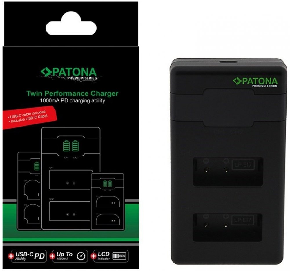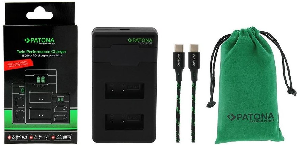 S rychlonabíječkou Patona DUAL lze nabíjet současně 2 baterie najednou, bez ohledu na to, zda mají obě baterie stejnou kapacitu. Nabíječky jsou vyráběny dle nejvyšších evropských standardů kvality a vyznačují se extrémně dlouhou životností. Nabíječku lze napájet skrze USB typ C port. Součástí balení je USB-C kabel (60cm) a ochranný obal. Vstupní napětí:5 V/ 2,4 A (9 V/ 2 A QC, PD)Výstupní napětí:8,4 V/ 1000 mA (x1), 600 mA (x2); 8,4 V/ 1500mA (x1), 1000mA (x2)Kompatibilní s bateriemi:Canon LP-E17Kompatibilní s přístroji:Canon EOS 750D, 760D, 8000D, Kiss X8i, Rebel, Rebel T6i, Rebel T6s, T6i, T6s; Blackmagic Pocket Cinema Camera 4K, Blackmagic Pocket Cinema Camera 6KUpozornění:Plné rychlosti nabíjení lze dosáhnout pouze s nabíječkou nebo power delivery s výkonem 20 W a více.