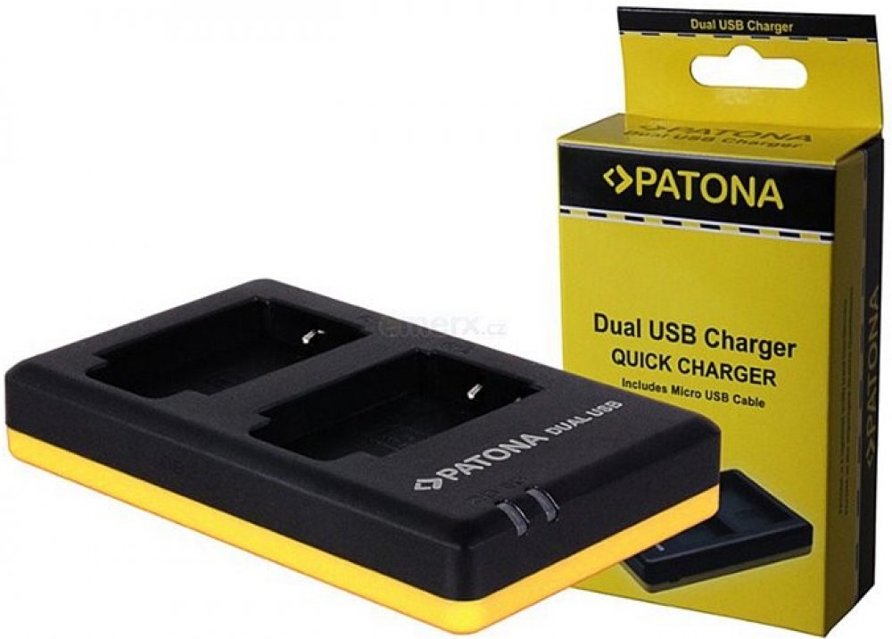 S touto nabíječkou lze nabíjet současně 2 baterie najednou. Je vybavena ochrannou proti přehřátí a přebíjení. Součásti balení je kabel USB/microUSB.