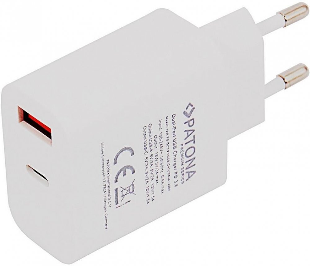 Napájecí adaptér PATONA s výkonem 18 W pro tablety a smartphony. Pro nabíjení zařízení jsou k dispozici konektory USB a USB typu C s podporou Power Delivery. Samozřejmostí je ochrana proti přehřátí a přepětí.