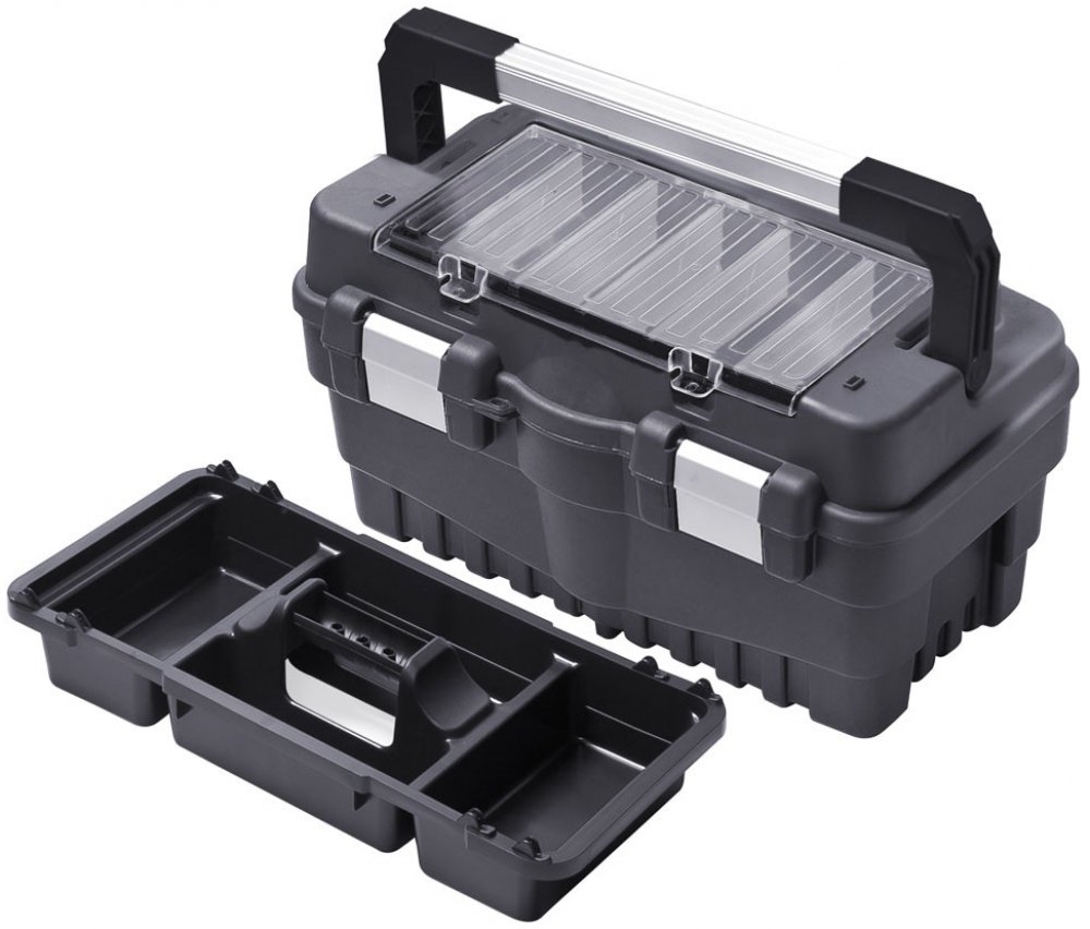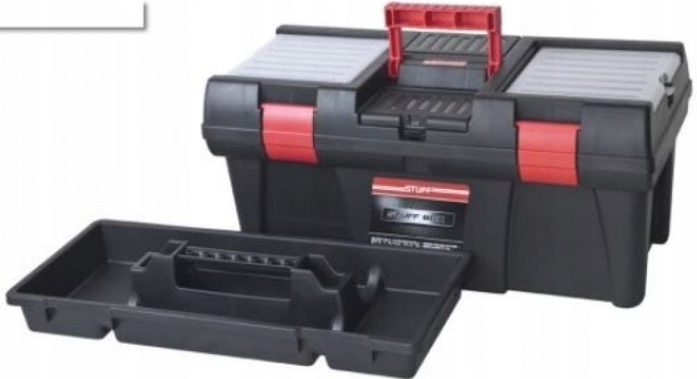 Kufr na nářadí STUFF SEMI PROFI CARBO je vyrobený z kvalitního plastu, ve vrchní části jsou dva organizéry pro drobné součástky uzavřené víkem."