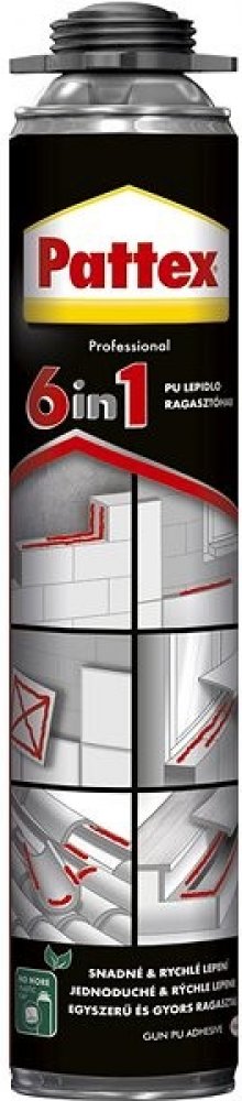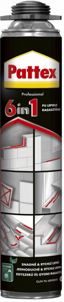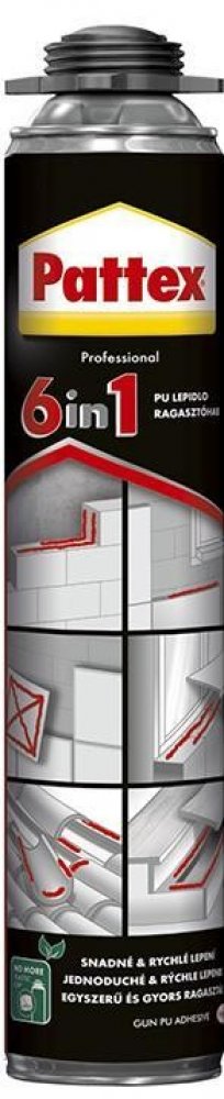 Pattex 6v1 je jednosložkové univerzální trubičkové PU lepidlo vhodné pro různé druhy lepení. Vyznačuje se vynikající přilnavostí k různým povrchům v kombinaci se snadnou schopností vyplnění. Díky tomu je obzvlášť vhodné pro nerovné povrchy. Použití PU lepidla pomáhá předcházet vzniku tepelných mostů. Má vynikající přilnavost na většinu stavebních materiálů, jako je dřevo, beton, kámen, kov atp. Plně vytvrzuje do 2 hodin, kompletní mechanická pevnost vzniká nejdříve za 24 hodin. Účinnost lepidla závisí na pracovních podmínkách – teplota, vlhkost vzduchu, podklad a aplikace. Výrobek neobsahuje hnací látky CFC. Oblast použití: Lepení zdiva a pórobetonu Lepení plošných panelů Lepení polystyrenu a izolačních prvků Lepení parapetů Lepení a izolace střešních prvků (nenahrazuje mechanické upevnění) Lepení schodišťových nášlapů Vnitřní a vnější lepení běžných stavebních materiálů Konstrukce vnitřních stěn Přilepení sádrokartonu na zeď Upevnění tepelné izolace (EPS, minerální vlákna, korek atd.) Přilepení OSB desek na zeď Výplň menších dutin atp.