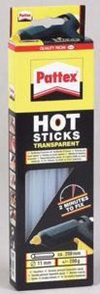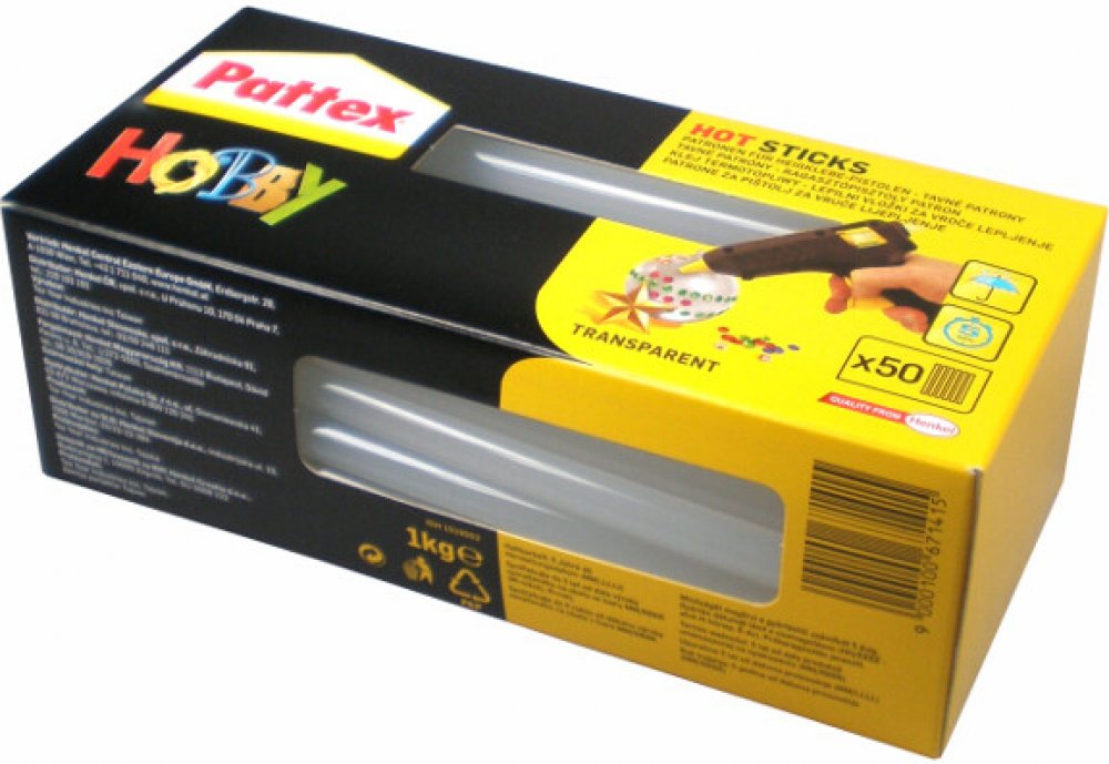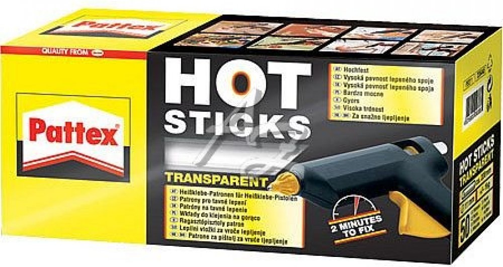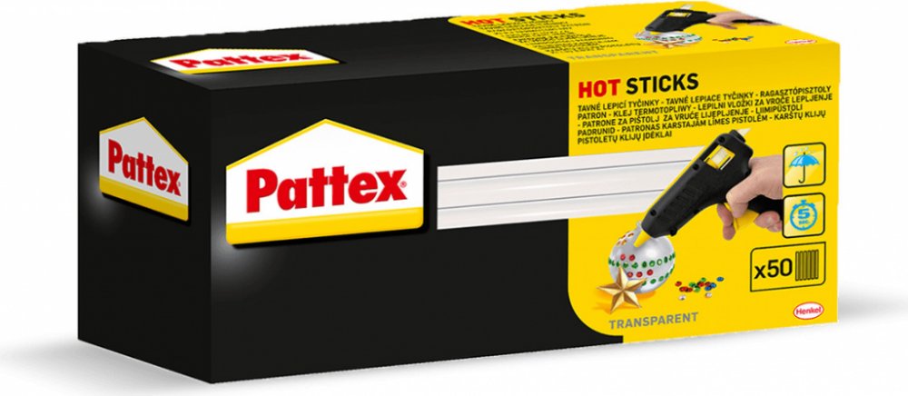 Pattex Hot Patrony – náplně do tavné pistole pro rychlé a čisté lepení Pattex Hot Patrony jsou transparentní tavné tyčinky určené pro lepení běžných materiálů při opravách, tvoření a dekorování. Jsou ideální volbou pro všechny, kdo chtějí pevný, čistý a bezbarvý spoj během několika vteřin. Spoj dosahuje své konečné pevnosti už po 2 minutách, je voděodolný a bez zápachu. Patrony jsou kompatibilní s většinou běžných tavných pistolí o průměru 11 mm. Vhodné pro široké spektrum materiálů – od dřeva přes keramiku, karton, sklo, textil až po dekorativní prvky a přírodní materiály. Neobsahují rozpouštědla a díky univerzálnímu použití se uplatní v domácnosti, dílně i při kreativní tvorbě. Ideální pro lepení dekorací, sušených květin, opravy drobných předmětů, nebo tvoření se dřevem. Hlavní výhody: Rychlý účinek – spoj je pevný a připraven k zatížení už po 2 minutách. Transparentní výsledek – čistý spoj, který neruší vzhled dekorací ani opravených předmětů. Široké využití – vhodné pro většinu běžných materiálů (dřevo, papír, karton, textil, kámen, sklo, kov atd.). Technické parametry: Typ: Tavné lepidlo (průměr 11 mm) Použití: Vnitřní i venkovní Vlastnosti: Bez zápachu, bez rozpouštědel, odolnost proti vlhkosti Není vhodné pro: měkčené PVC, PE, PP, PTFE Vytvrzení: do 2 minut Jak používat: Zasuňte patronu do rozehřáté tavné pistole (zahřívání cca 8–10 minut). Aplikujte lepidlo na čistý, suchý povrch stisknutím spouště. Přiložte materiály k sobě a pevně přitlačte. Spoj lze zatížit už po 2 minutách. Tip na čištění: