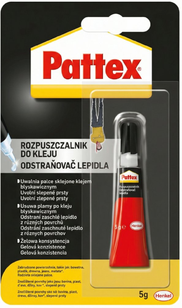 Pattex Odstraňovač lepidla (Glue Remover) je nepostradatelným doplňkem ke každému vteřinovému lepidlu. Zaschlé kyanoakrylátové lepidlo je mechanicky téměř neodstranitelné, ale tento speciální gel jej dokáže chemicky narušit a rozpustit.