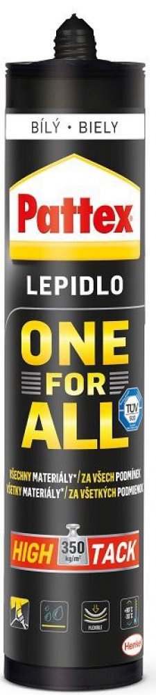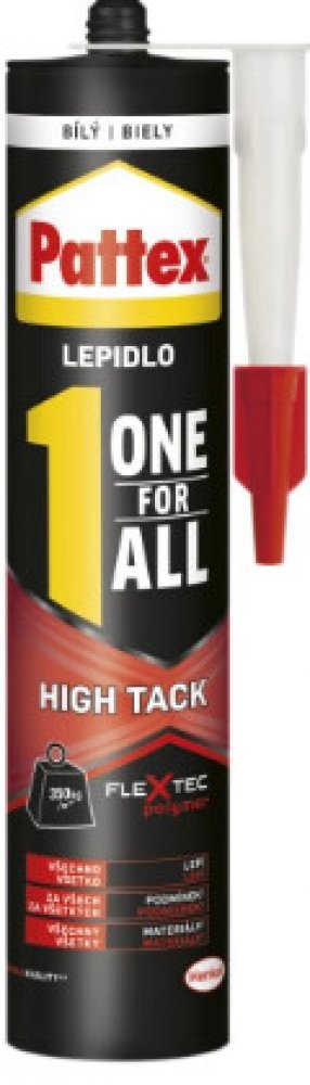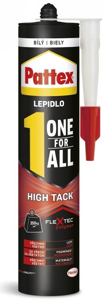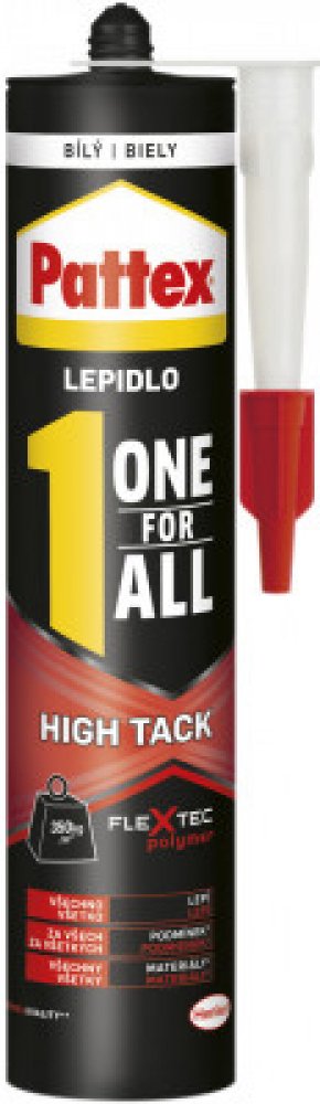 Jednosložkové bílé univerzální montážní lepidlo Pattex ONE FOR ALL HIGH TACK můžete použít v interiéru i exteriéru. Jeho patentovaná receptura FlexTec zaručuje vysokou flexibilitu a pevnost spoje i v těch nejnáročnějších podmínkách. Při lepení nestéká, nepropadá se, tlumí zvuk i vibrace a lepí širokou škálu savých i nesavých materiálů. Vytvrzuje vzdušnou vlhkostí, korekce spoje je možná ještě několik minut po slepení. Po vytvrzení přetíratelné a brousitelné, neobsahuje isokyanáty a rozpouštědla, lze ho nanášet i na vlhký podklad. PATTEX ONE FOR ALL HIGH TACK - nejsilnější montážní lepidlo na FlexTec polymerové bázi. vysoká počáteční pevnost 350 kg/m² vysoká konečná pevnost 2,3 N/mm² (23,5 kg/cm²) flexibilní nestéká nepropadá se lepí širokou škálu materiálů tlumí zvuk i vibrace vysoká počáteční pevnost 350 kg/m² vysoká konečná pevnost 2,3 N/mm² (23,5 kg/cm²) flexibilní nestéká nepropadá se lepí širokou škálu materiálů tlumí zvuk i vibrace Oblasti použití: Cihla, keramika, beton, dřevovláknité desky, dřevotřískové desky, sádrokarton, překližka, přírodní kámen, mdf, dřevo, kov, tvrzené pvc, polystyren, sklo, plasty, lakované povrchy, zrcadla.