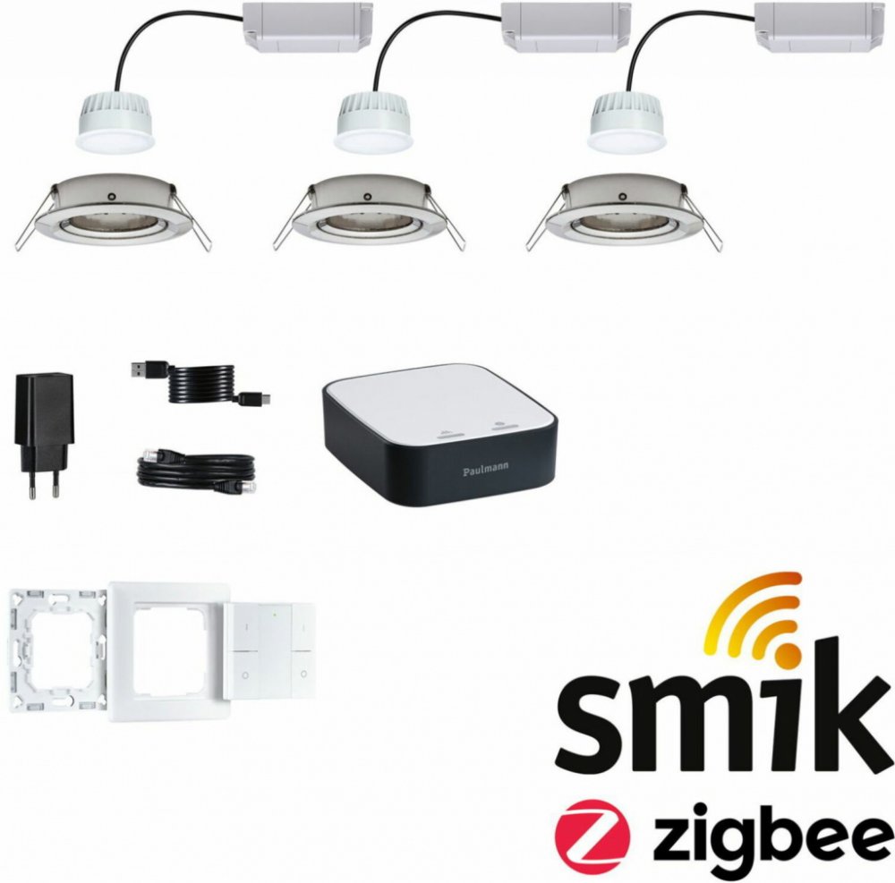 Startovací sada Smart Home od PAULMANNChytrá kombinace designu a technologieTato startovací sada představuje ideální spojení stylového designu a moderní Zigbee 3.0 technologie. Obsahuje trojici výklopných LED vestavných svítidel Nova Plus s funkcí měnitelné bílé, Zigbee 3.0 nástěnný ovladač a Zigbee 3.0 smik Gateway.Flexibilní osvětlení s funkcí Tunable WhiteS funkcí Tunable White měnitelných LED svítidel můžete snadno přecházet mezi pracovním denním světlem a teplým bílým světlem pro relaxaci. Osvětlení lze ovládat podle vašich potřeb prostřednictvím aplikace, hlasového asistenta nebo ovladače, a to jak z domova, tak na cestách.Individuální konfigurace a ovládáníPomocí aplikace smik můžete osobně nastavit chytrý nástěnný ovladač pro individuální ovládání místností a vlastních světelných scén. Toto startovací řešení je ideální jak pro nové instalace, tak pro výměnu stávajícího osvětlení, přičemž přináší osvětlení na novou, chytrou úroveň.Další výhody sady Výhodná cena při zakoupení sady Obousměrný přenos dat Přímé ovládání Zigbee produktů přes Touchlink Snadné a flexibilní ovládání pomocí aplikace, hlasu nebo příslušenství Přímé připojení na 230V Pohodlné osvětlení s automatickými rutinami a bezpečným ovládáním z dálky Moderní řídící centrum pro vaši chytrou světelnou Zigbee síť od Paulmann Možnost zapínání a stmívání dvou světelných skupin s až 15 zařízeními každá Samostatné ovládání světelné skupiny pomocí tlačítkového ovladače Sada obsahuje 3 svítidla včetně LED modulu Stavová LED poskytuje zpětnou vazbu k mačkání tlačítek a stavu systému Ovládání možné také pomocí Smart Home Zigbee dálkového ovladače Lze nadále zapínat a vypínat přes klasický světelný vypínač