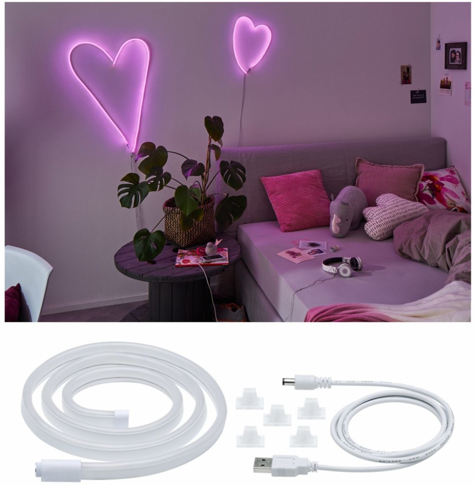 LED pásek Neon Colorflex USB - flexibilní LED pásek s USB připojením Neonový proužek, který díky 120 LED diodám barevně září, lze ohýbat nebo skládat, a lze jej tak získat do nejrůznějších tvarů. Tvar vytvořený pruhem je nastaven na scénu s homogenním efektem neonového světla bez viditelných světelných bodů. Pás lze připojit k powerbance, PC nebo notebooku pomocí USB zástrčky nebo do zásuvky pomocí zásuvkového adaptéru (není součástí dodávky). Pás lze připevnit na zeď pomocí dodávaných, průhledných přídržných spon.